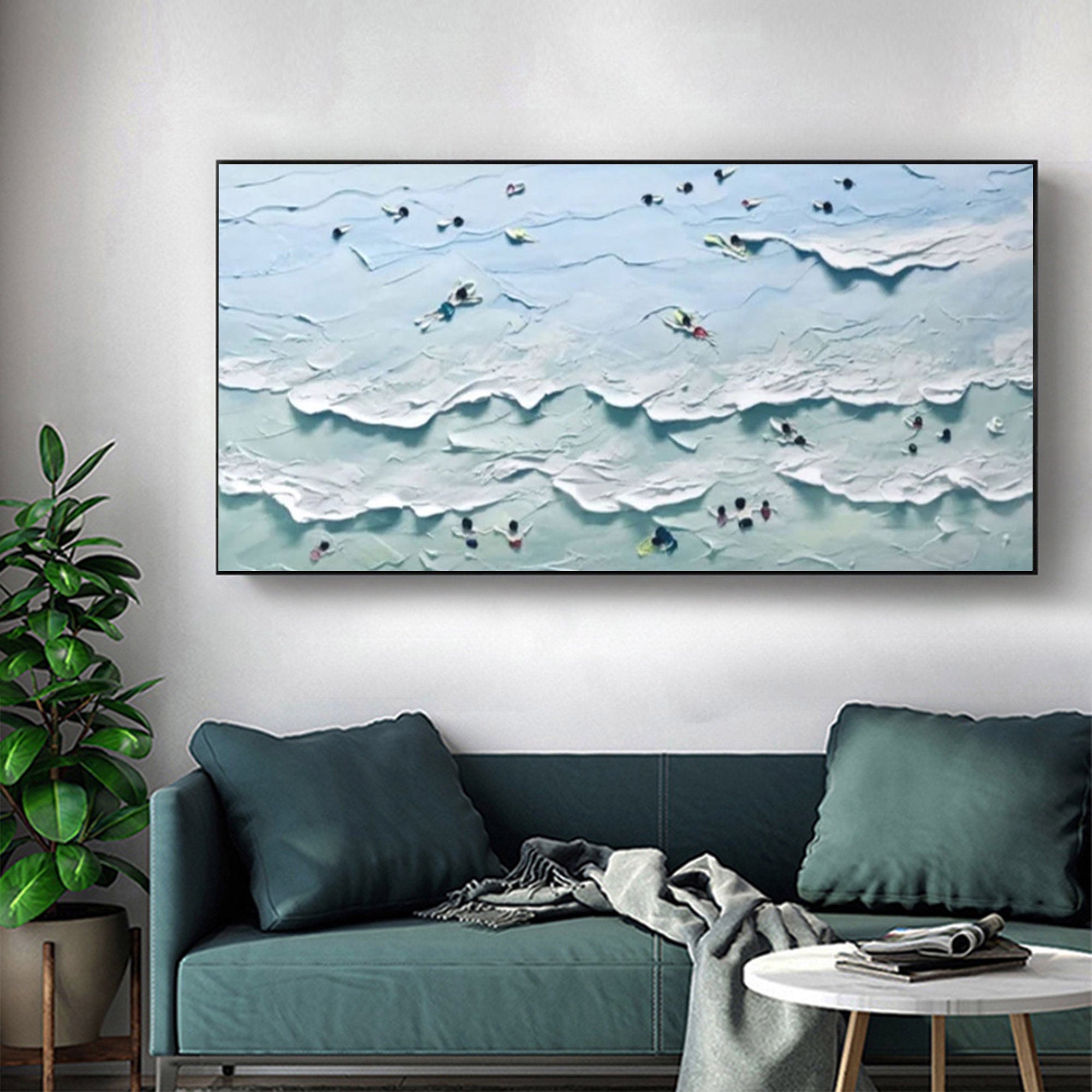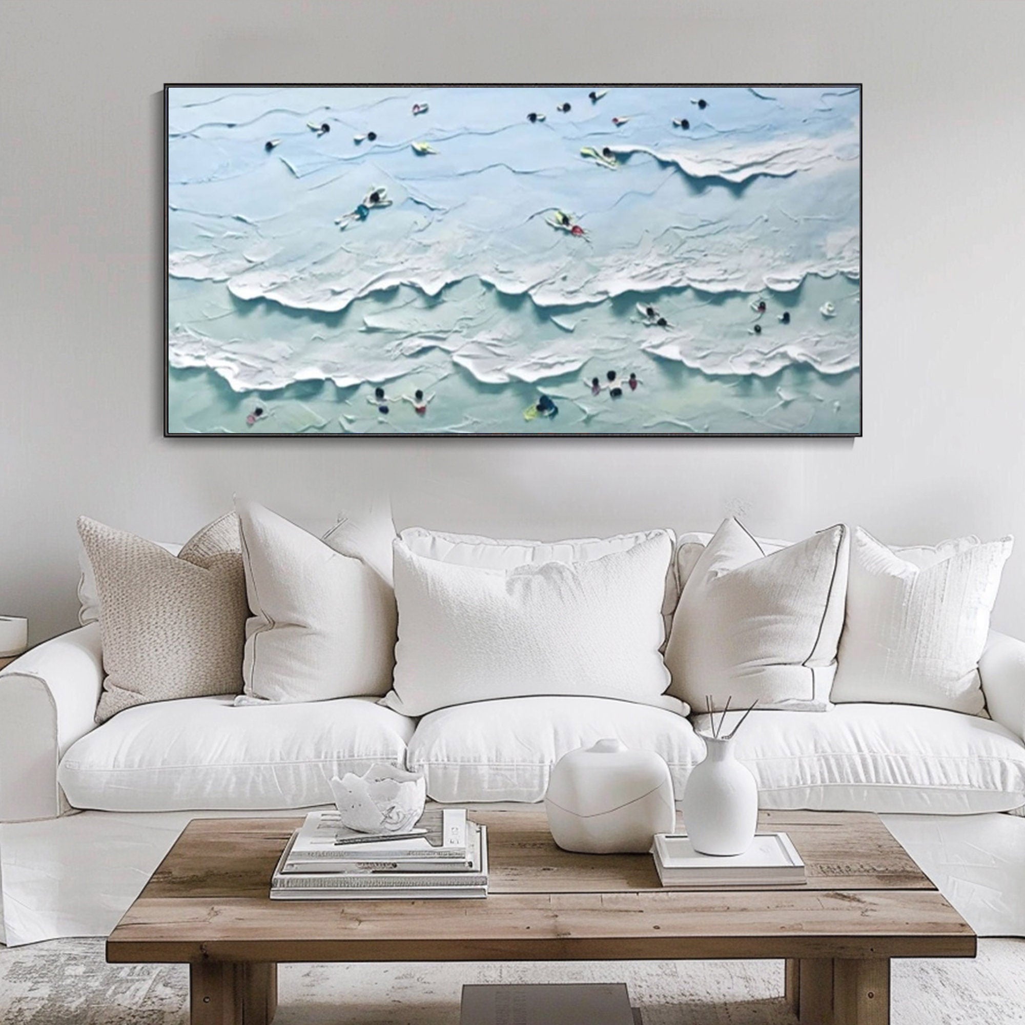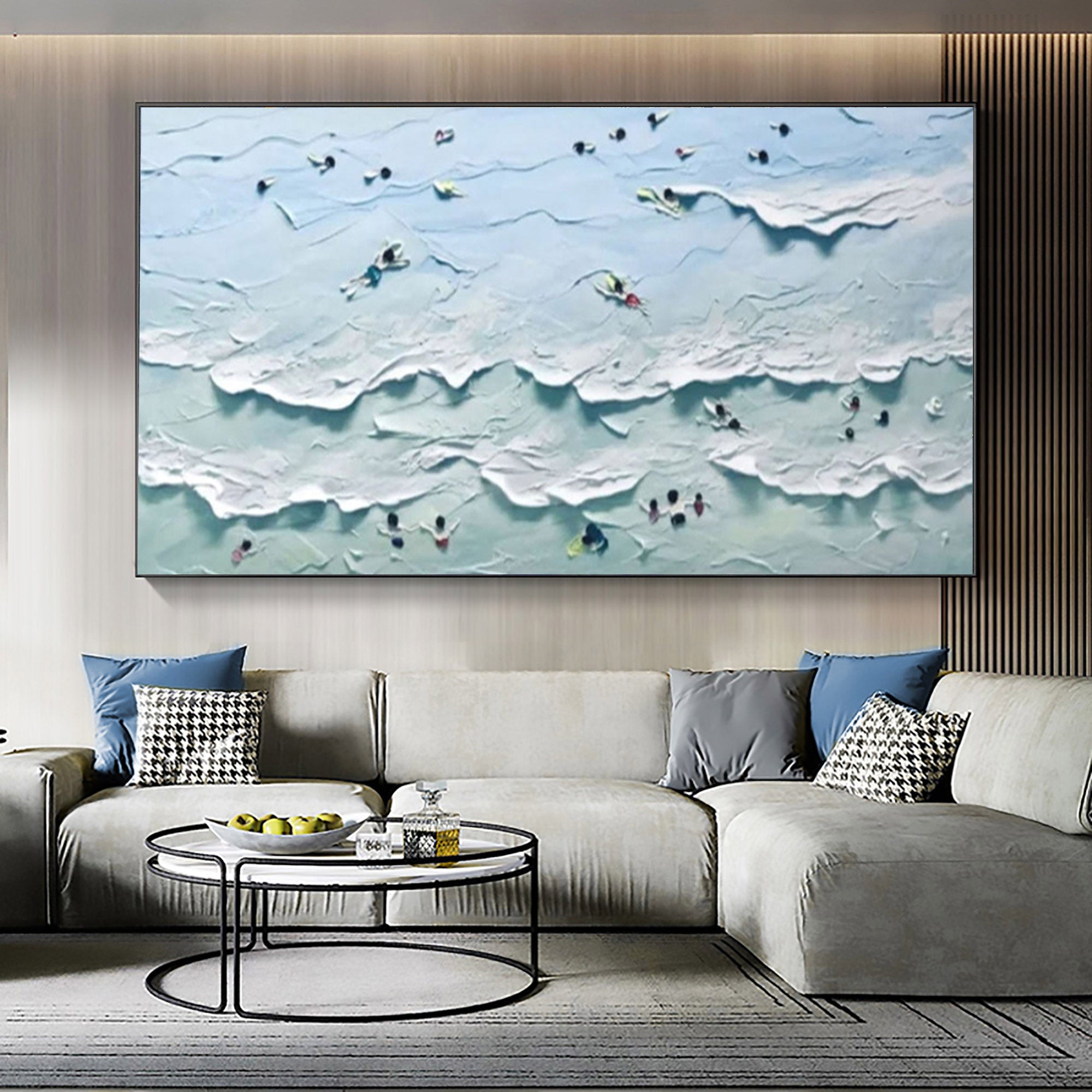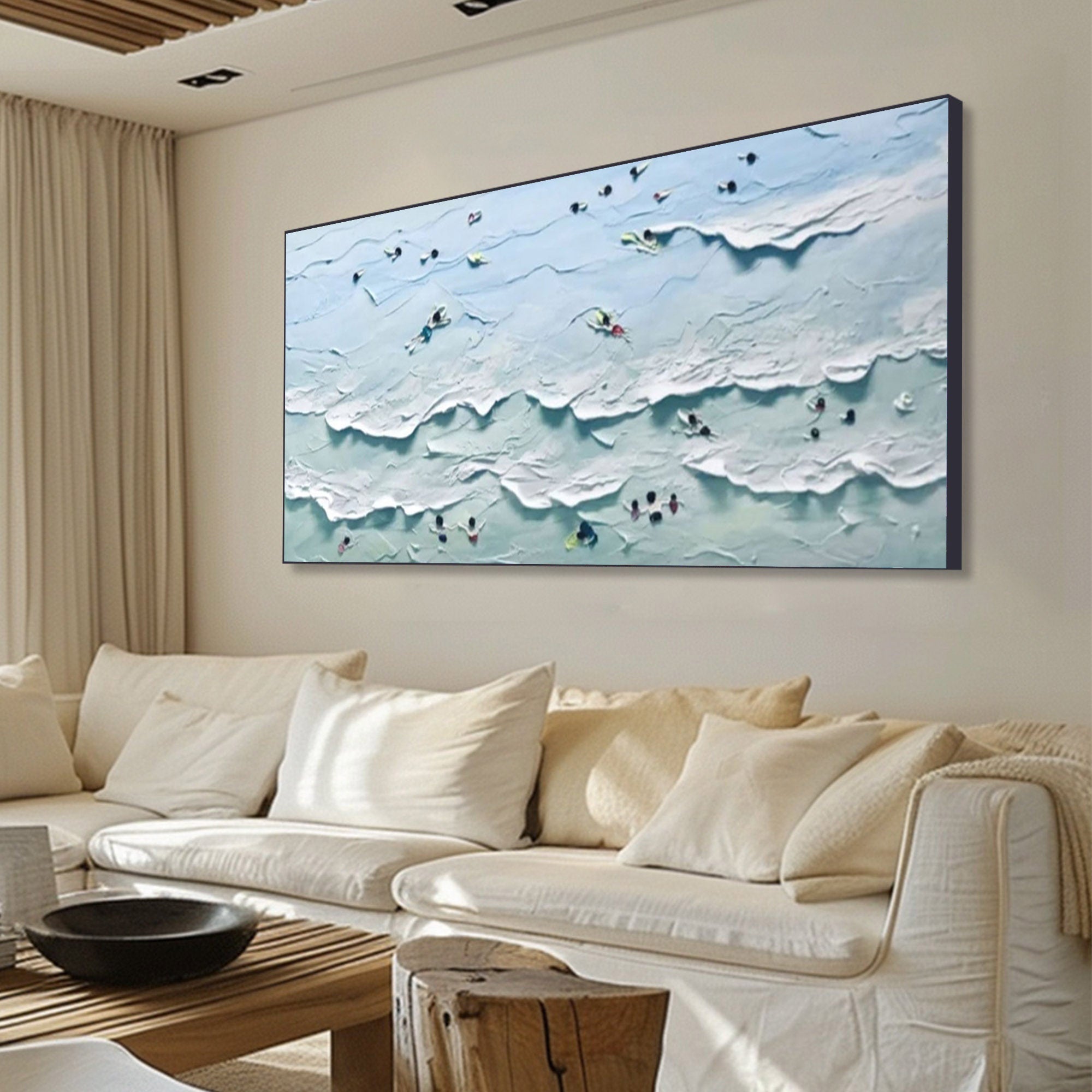 This horizontal textured ocean waves wall art beautifully portrays the tranquility of the sea, featuring swimmers amidst layered, textured waves. The soft hues and detailed textures bring a sense of calm and serenity, making it an ideal choice for coastal wall art or modern living room decor. Perfect for creating a statement, this piece elevates the ambiance of any space with its unique design and horizontal layout.