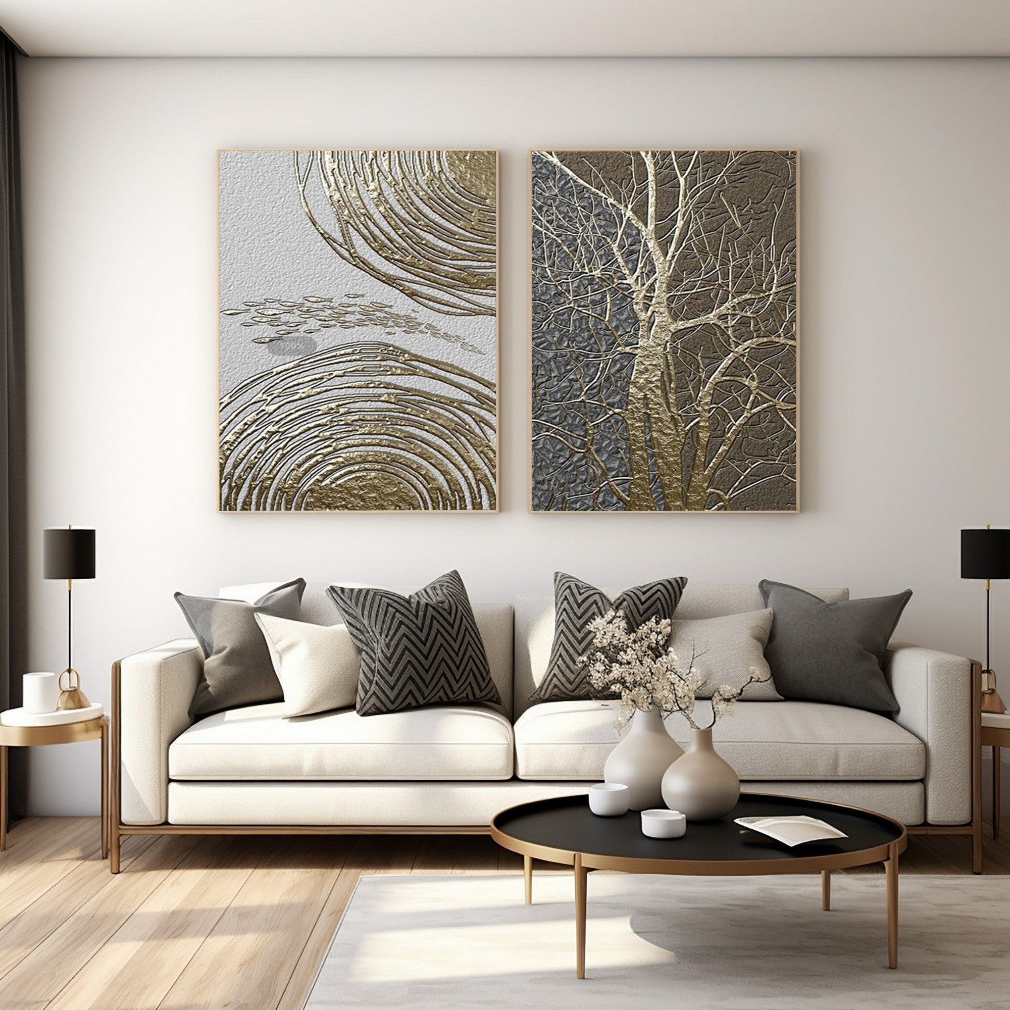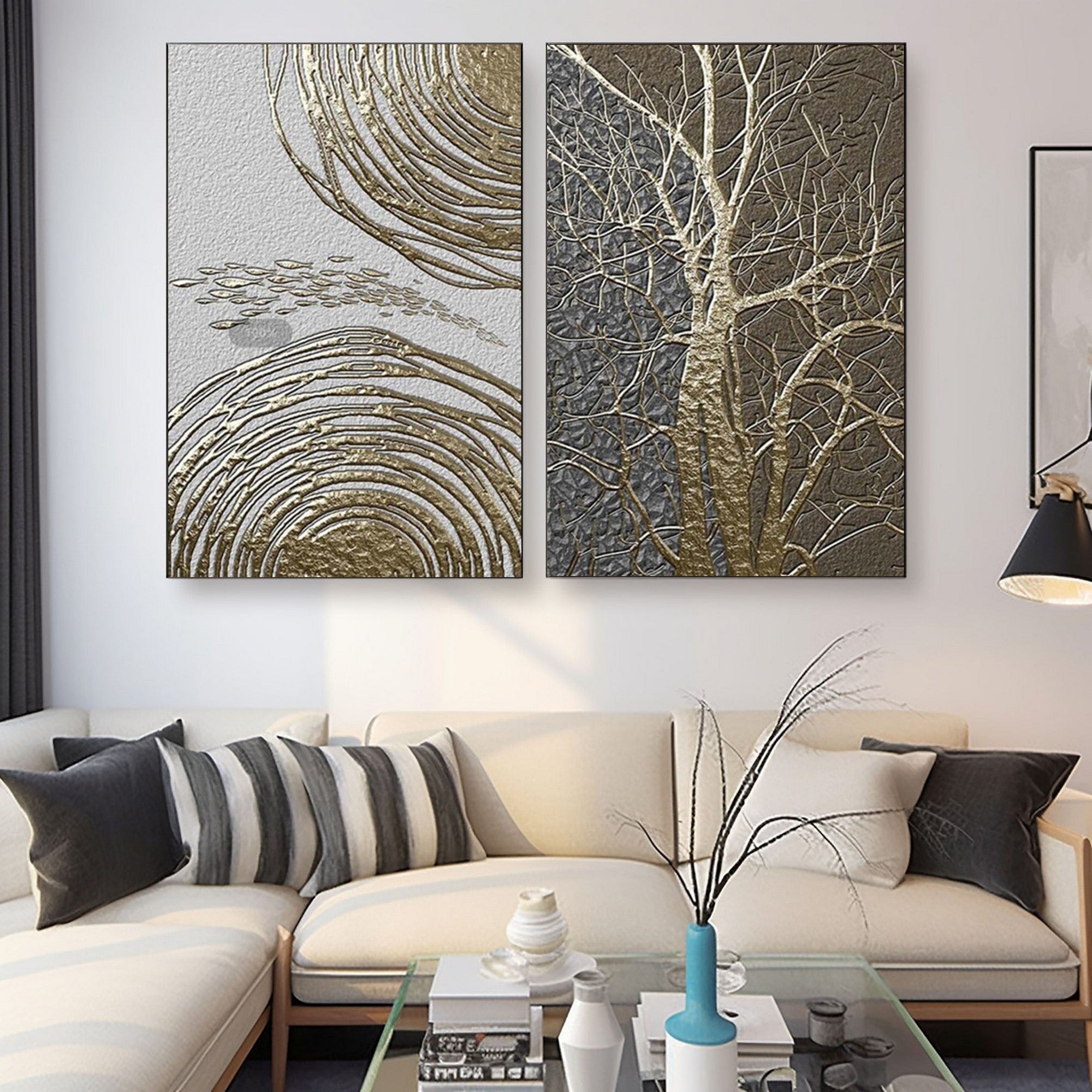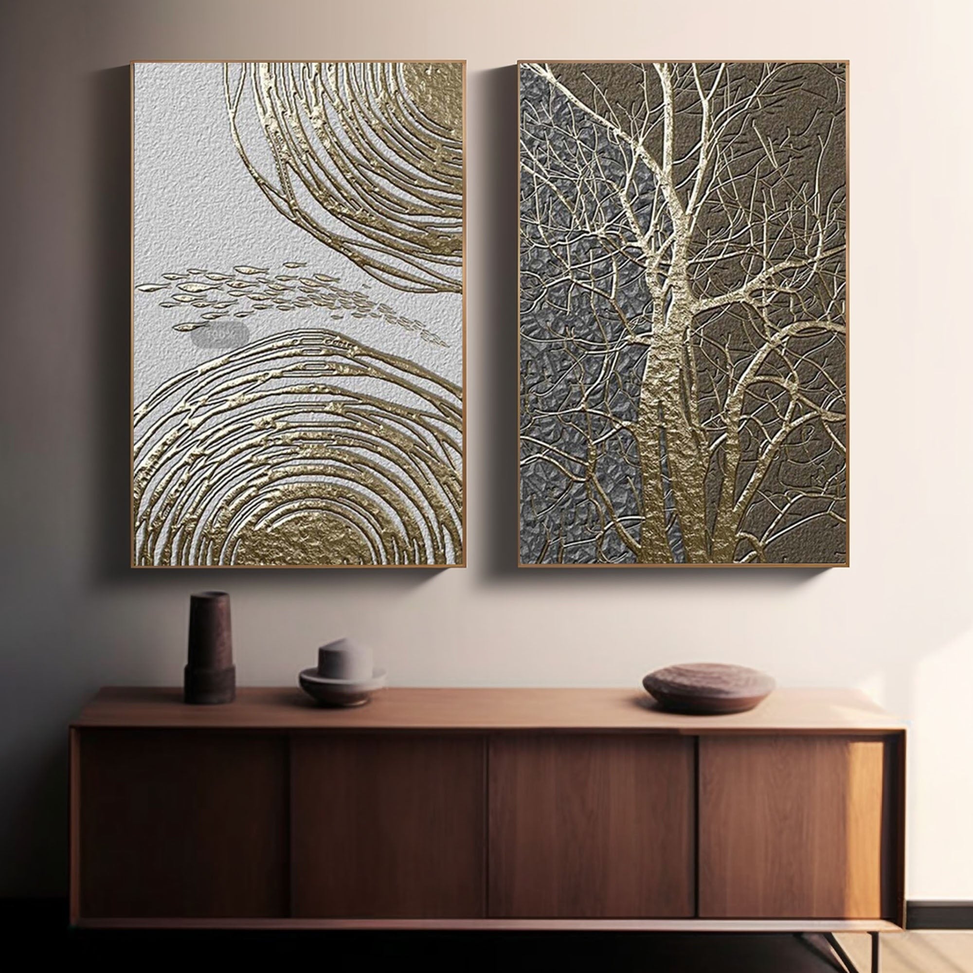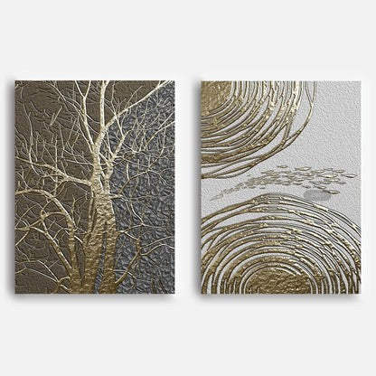 This elegant abstract metal wall art set features a mesmerizing blend of gold tree and ripple patterns, creating a sophisticated focal point for any space. The intricate textures and shimmering gold details evoke a sense of natural harmony, making this artwork an ideal choice for modern wall art in living rooms, bedrooms, or offices. Its sleek design complements both minimalist and luxurious interior aesthetics.