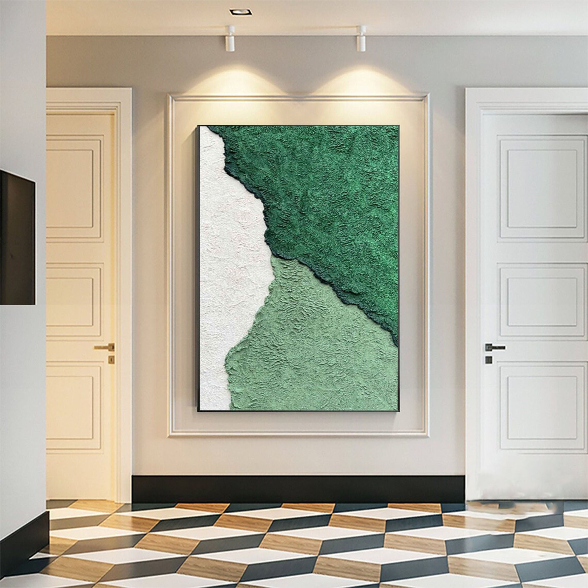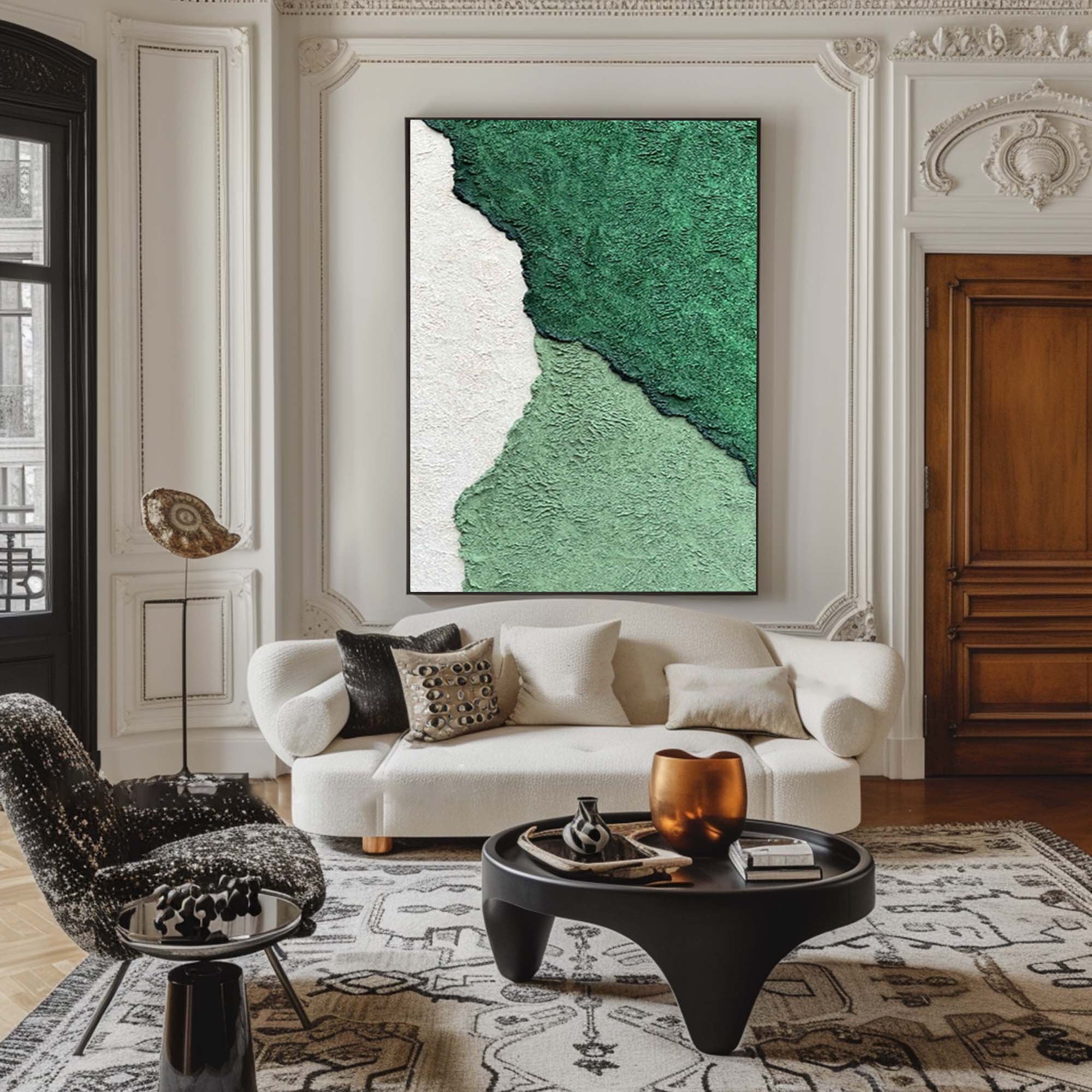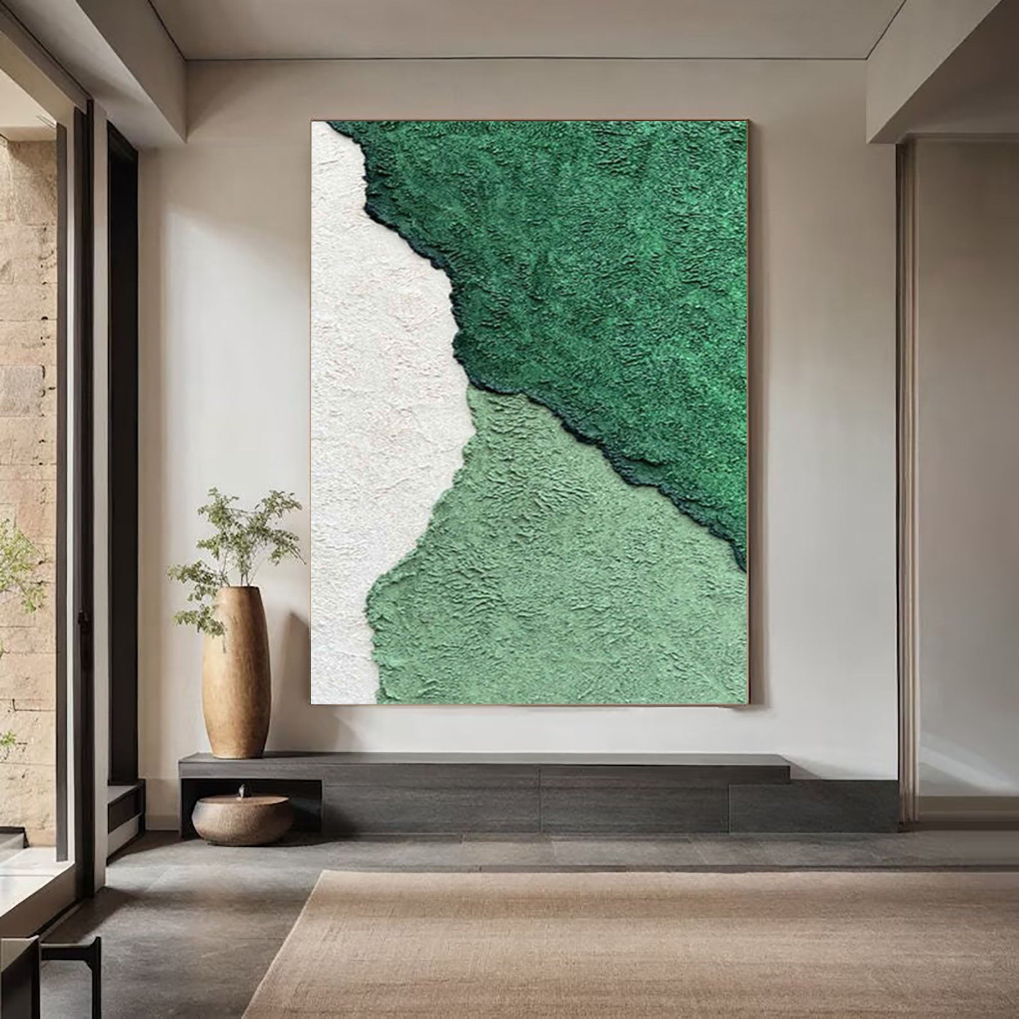 This abstract textured green artwork showcases a stunning blend of vibrant green tones and earthy whites, layered with rich texture to create a harmonious balance between nature and artistry. Its unique composition makes it a standout piece, perfect for those who appreciate the calm and elegance of Wabi Sabi wall art. The textured surface and organic design bring depth and character, making it an exceptional choice for enhancing contemporary interiors.
