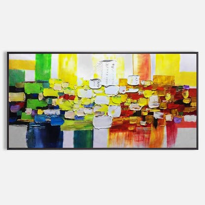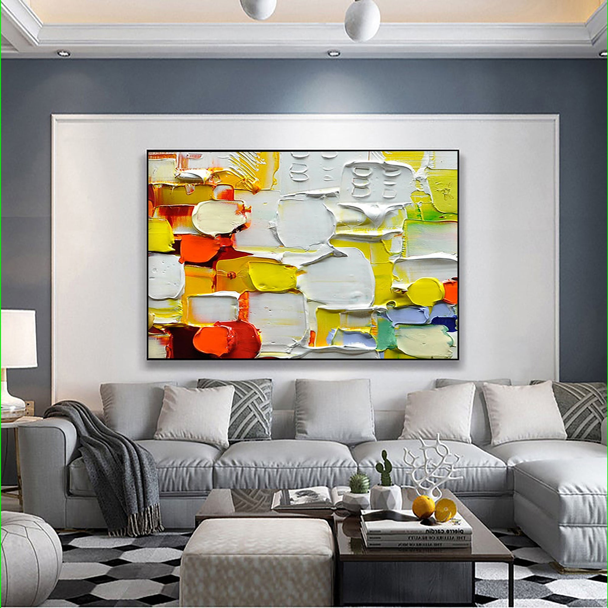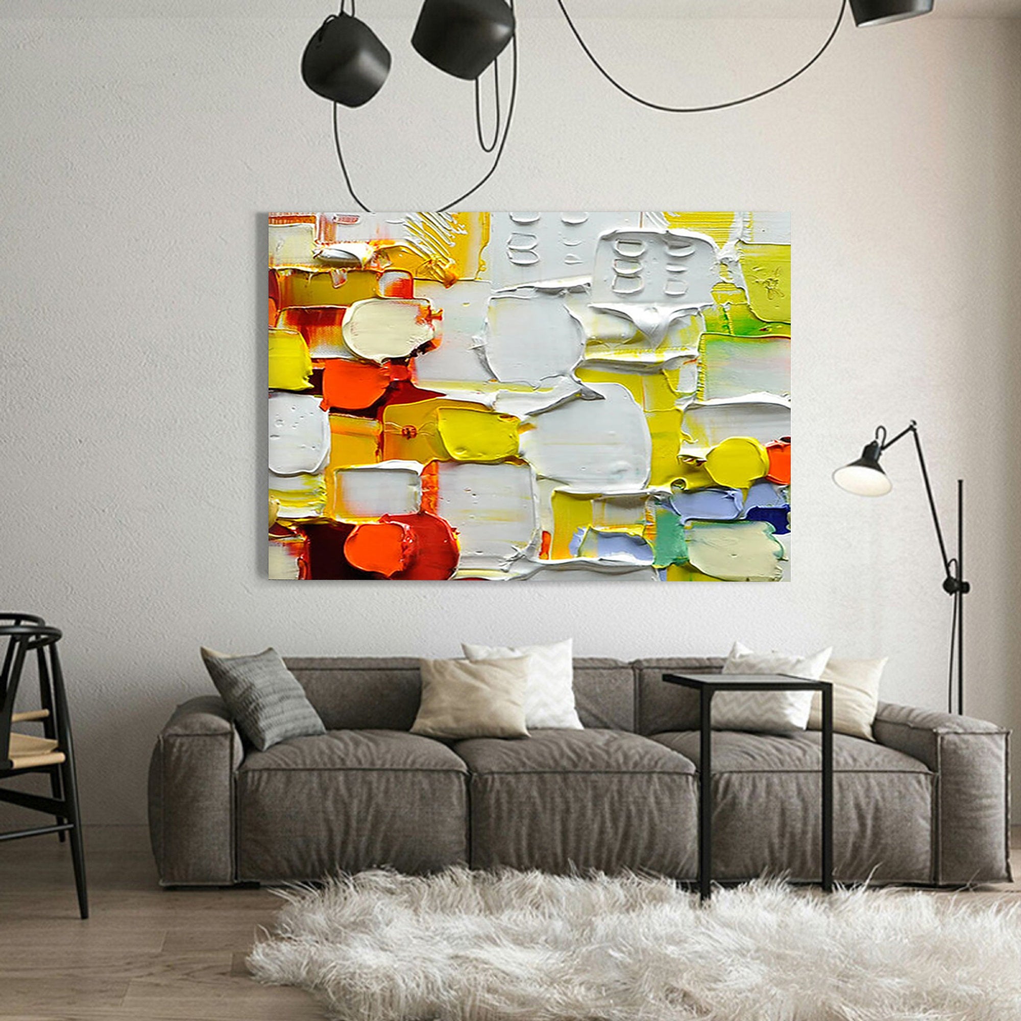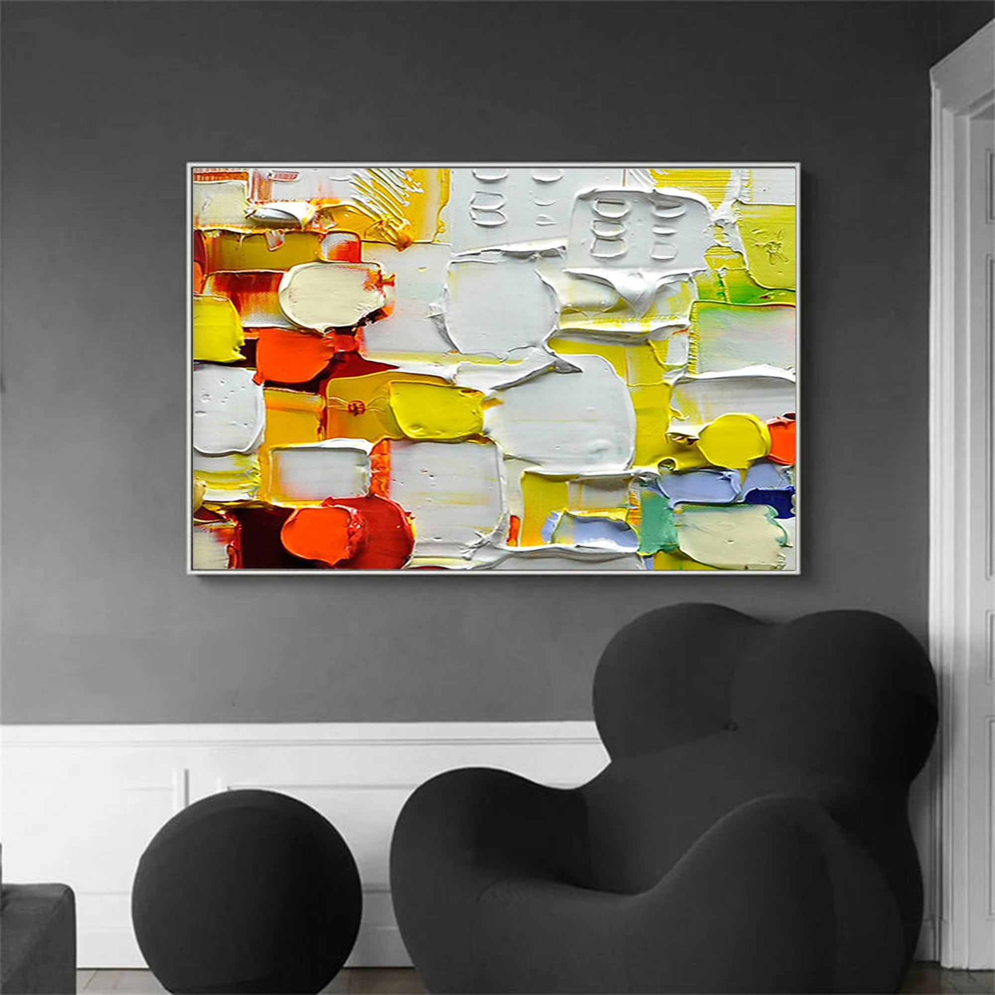 Add a touch of sophistication to your space with this abstract textured wall art, a vibrant blend of color and texture that captures the eye and elevates any room. Its dynamic composition is ideal as wall art for living room, bedrooms, or even modern office spaces. With a bold palette of yellows, whites, and reds, this large wall art creates a focal point that complements minimalist or eclectic interiors.
