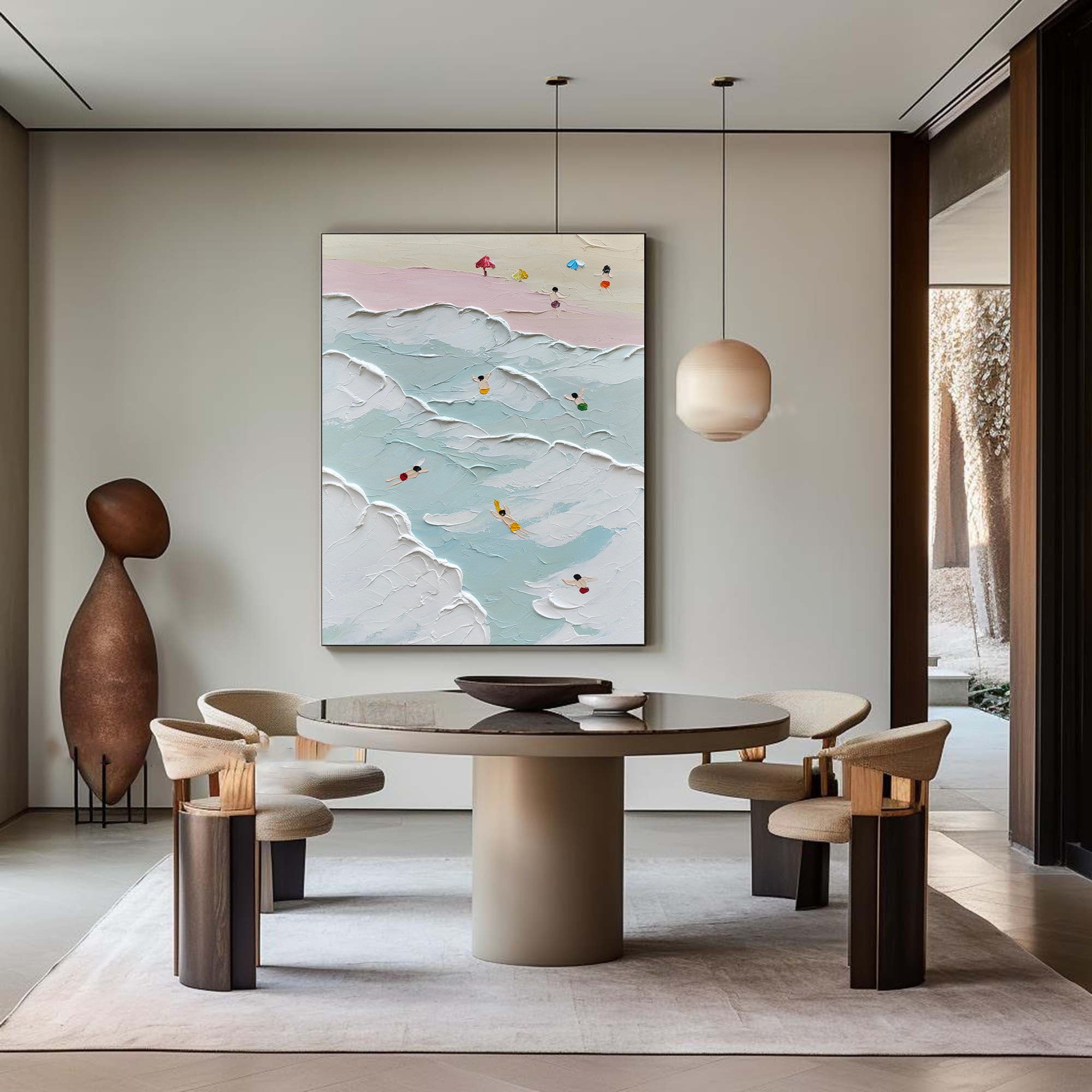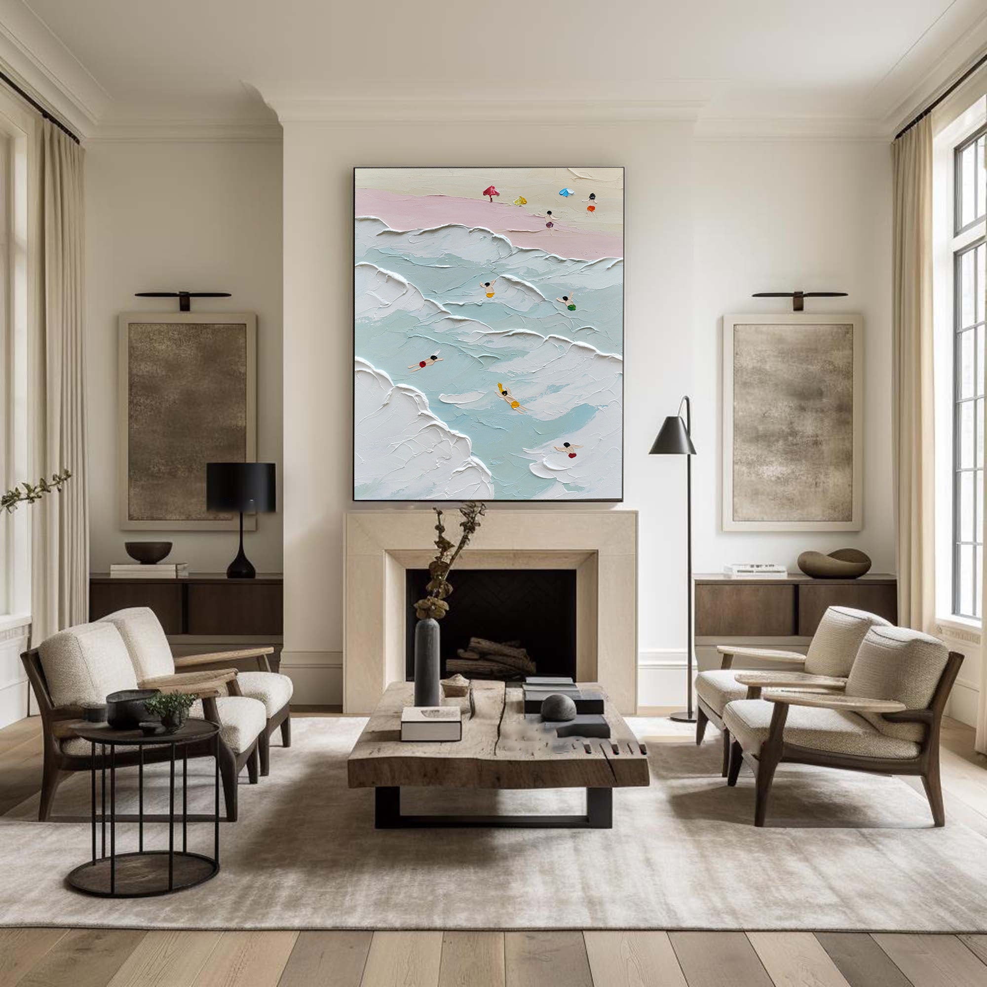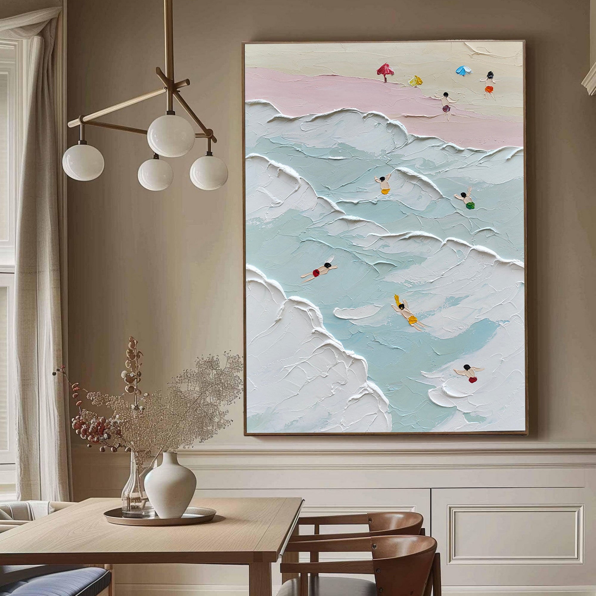 This beach and ocean scene plaster texture wall art brings the lively spirit of a seaside day to your home. Featuring swimmers in vivid colors and textured ocean waves, it creates a dynamic and serene ambiance. Perfect for enhancing coastal wall art collections or adding charm to modern wall decor, this piece captures the harmony of nature and artistry.