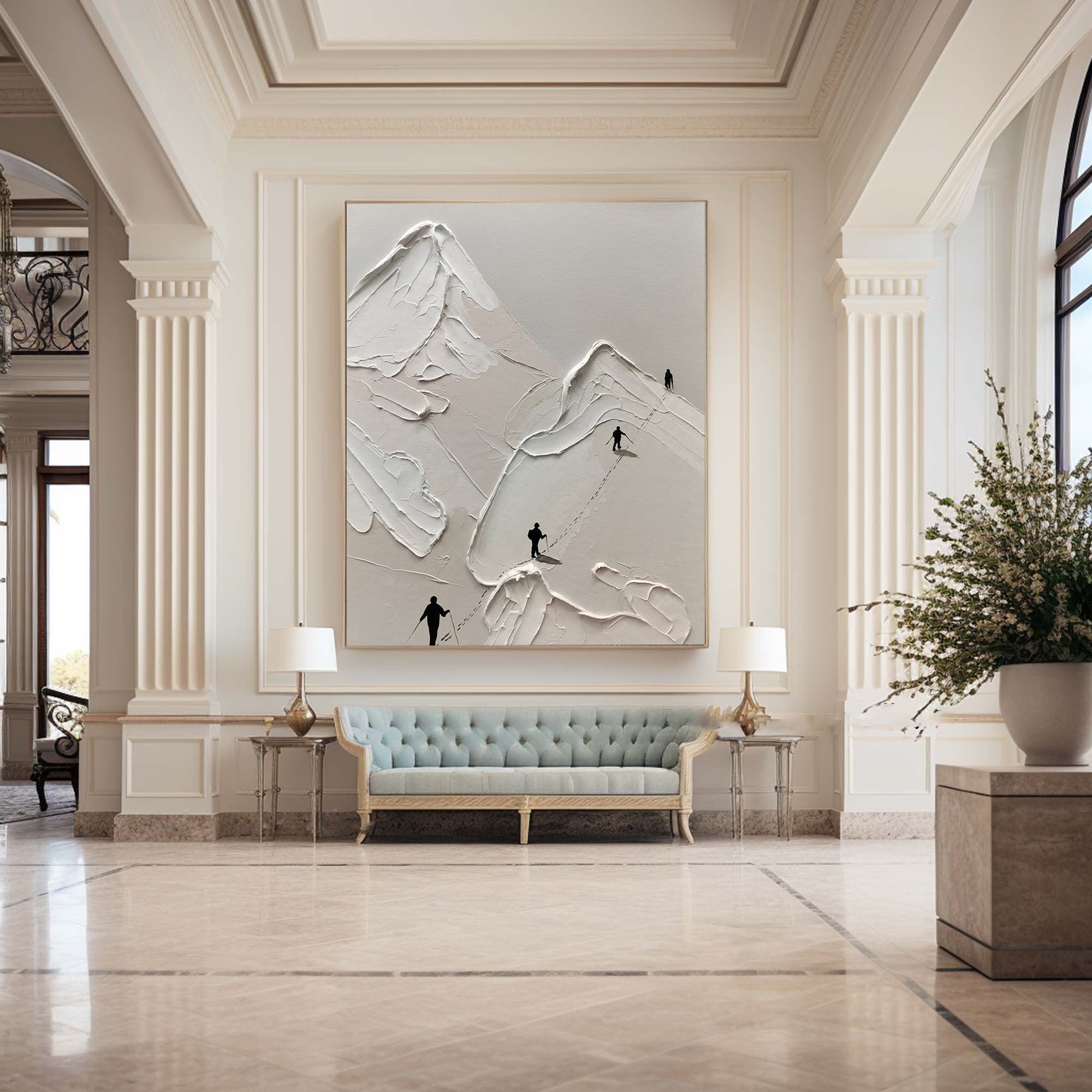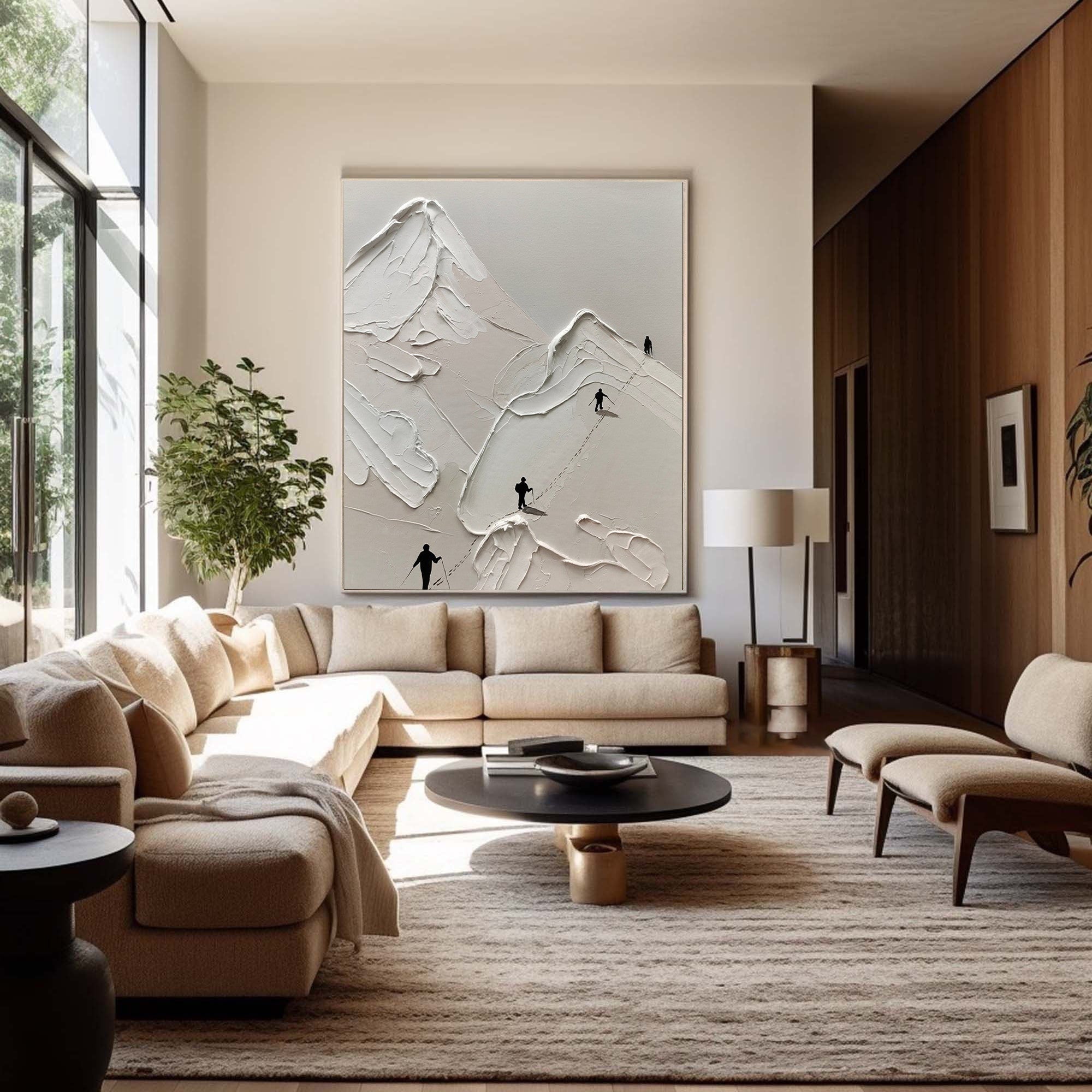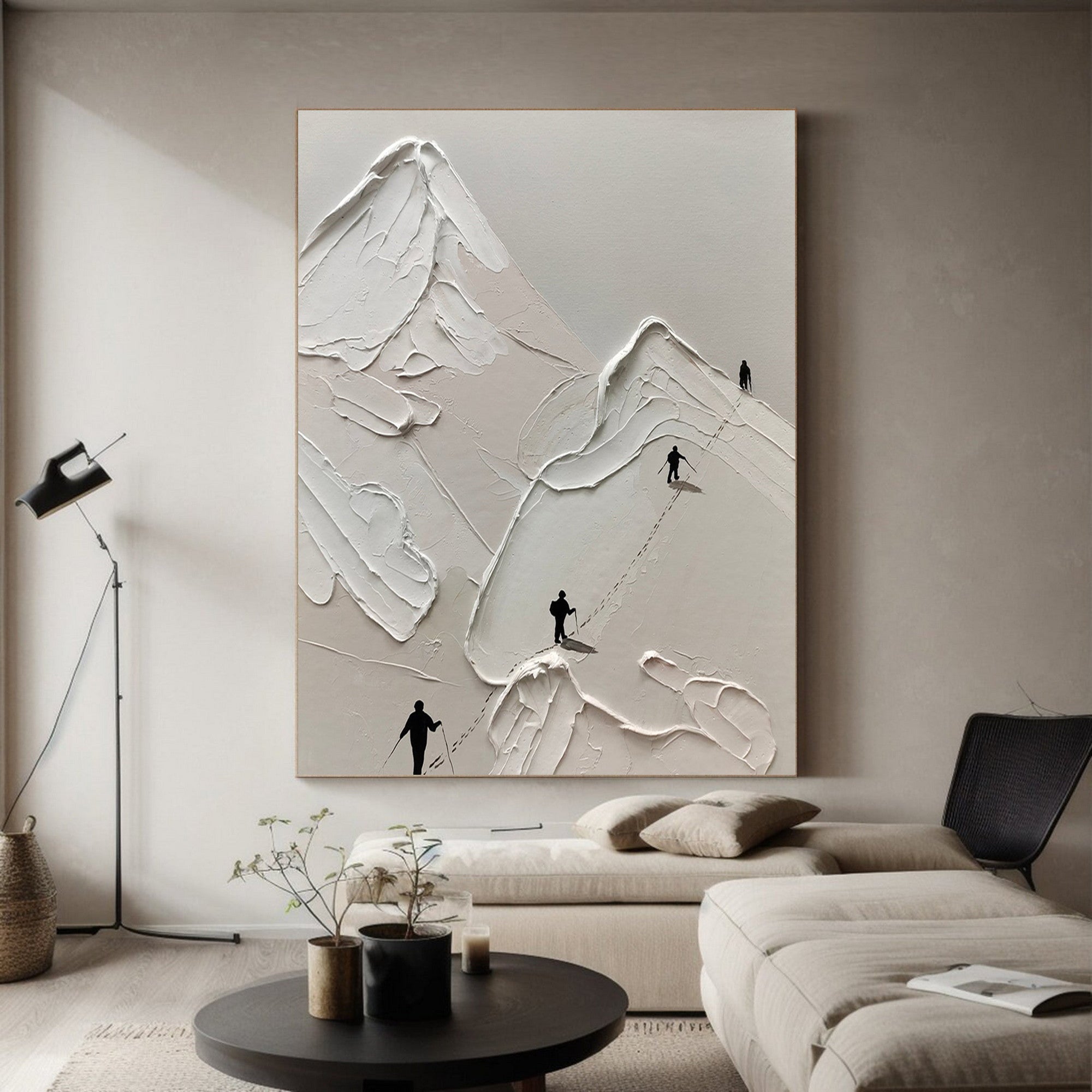 This minimalist mountain climber textured wall art portrays a serene yet adventurous scene, featuring hikers ascending textured mountain peaks. The muted tones and clean lines create a refined aesthetic, making it perfect for modern wall decor. Ideal for living room wall art, bedroom decor, or artwork gallery collections, this piece combines contemporary design with the spirit of exploration.