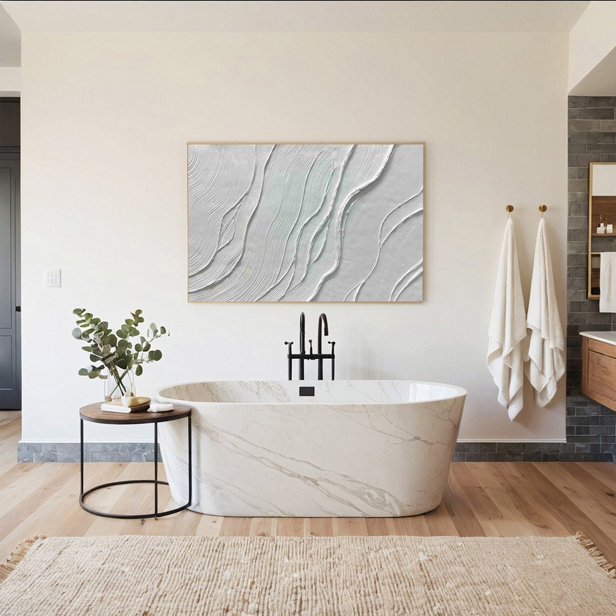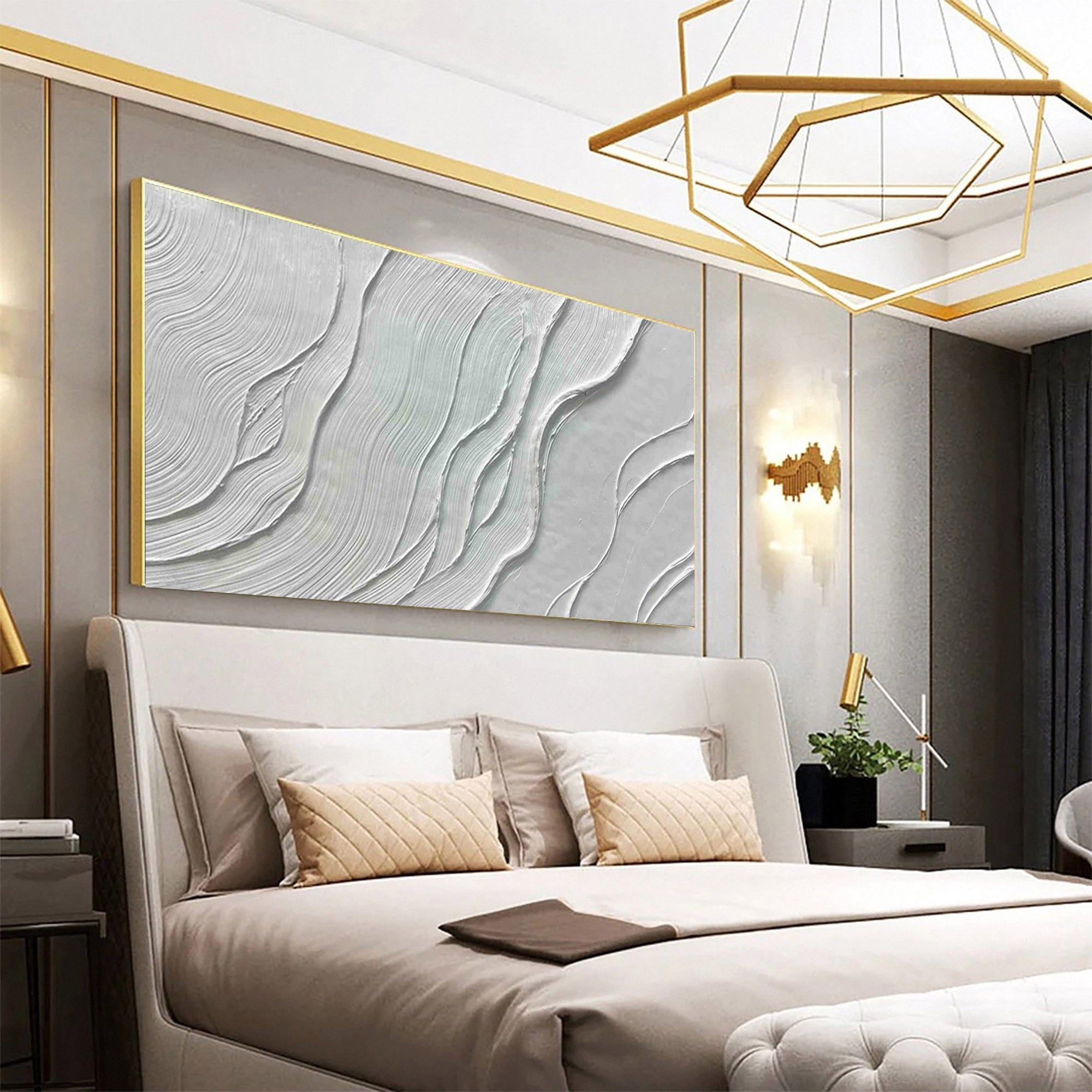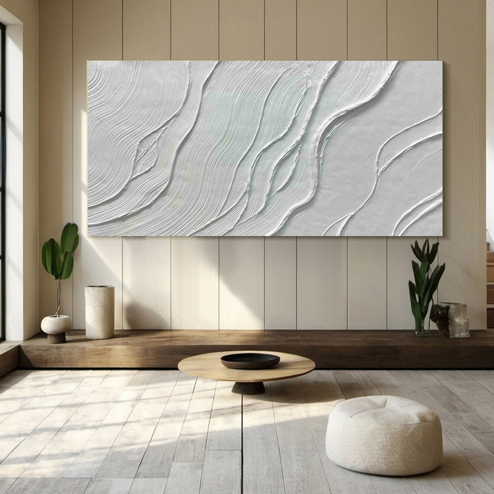 This flowing minimalist textured abstract wall art showcases a serene design of layered textures and subtle, wave-like patterns. Its clean and modern composition makes it an ideal choice for living room wall art, bedroom decor, or office spaces. The refined details add depth, making it perfect for those seeking elegant modern wall decor.