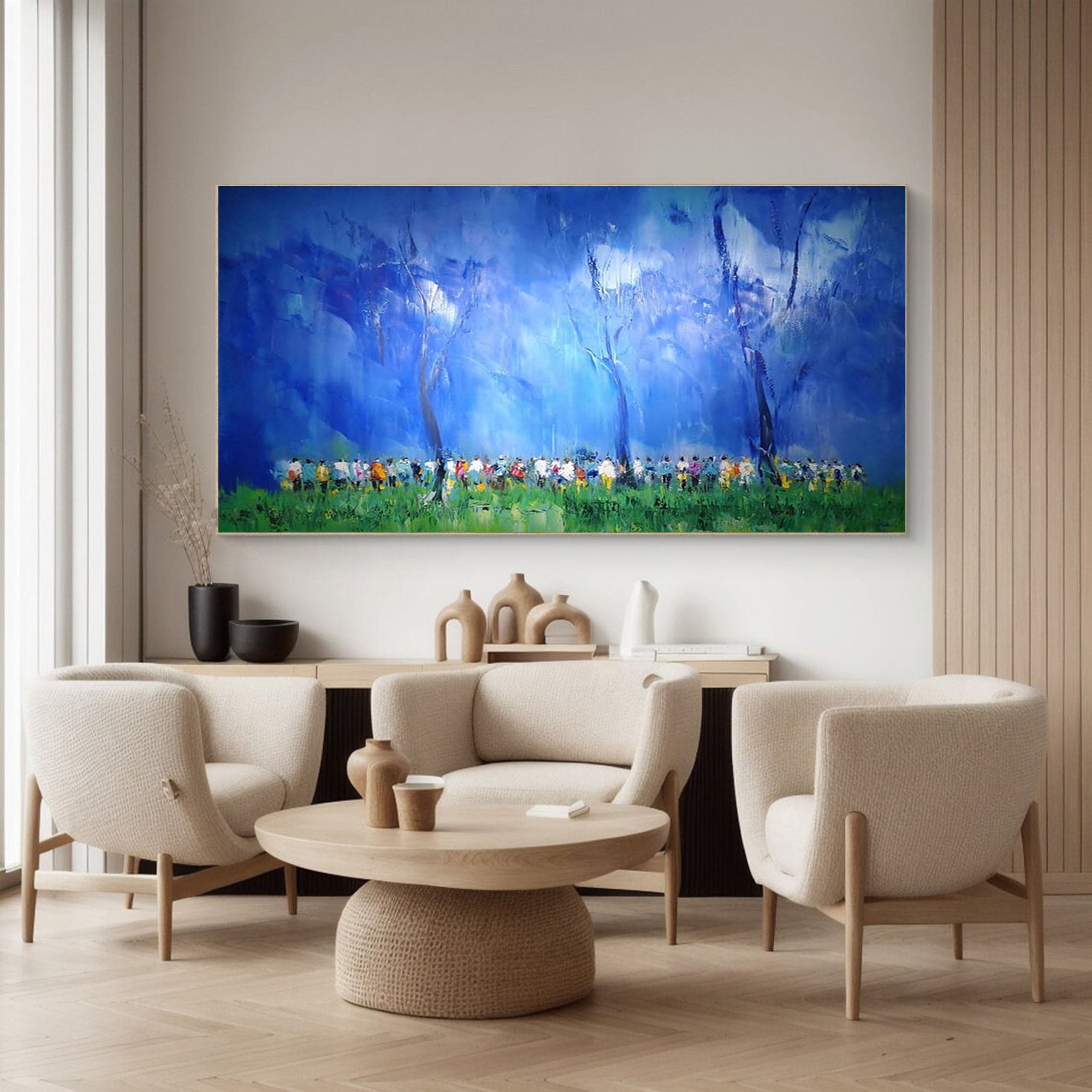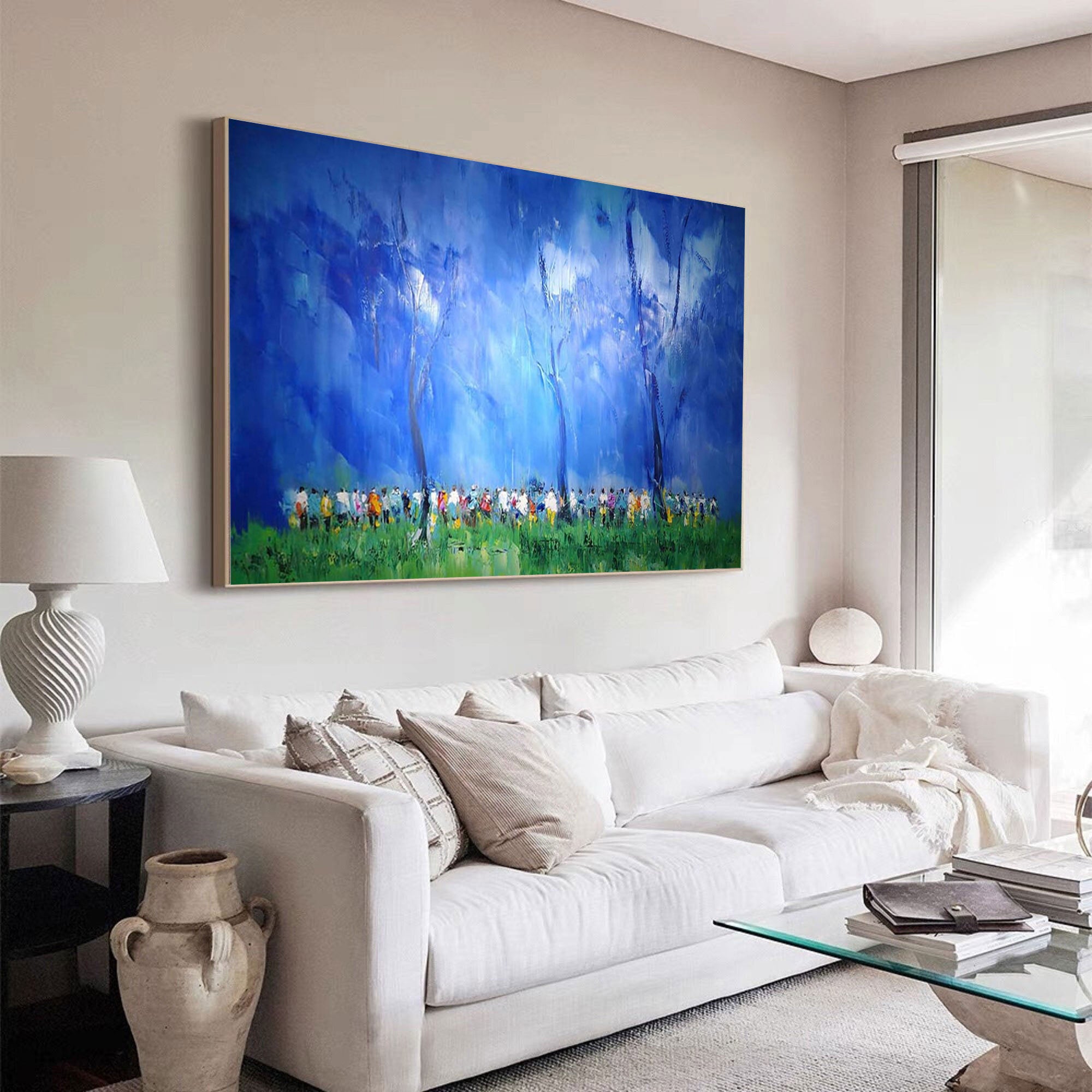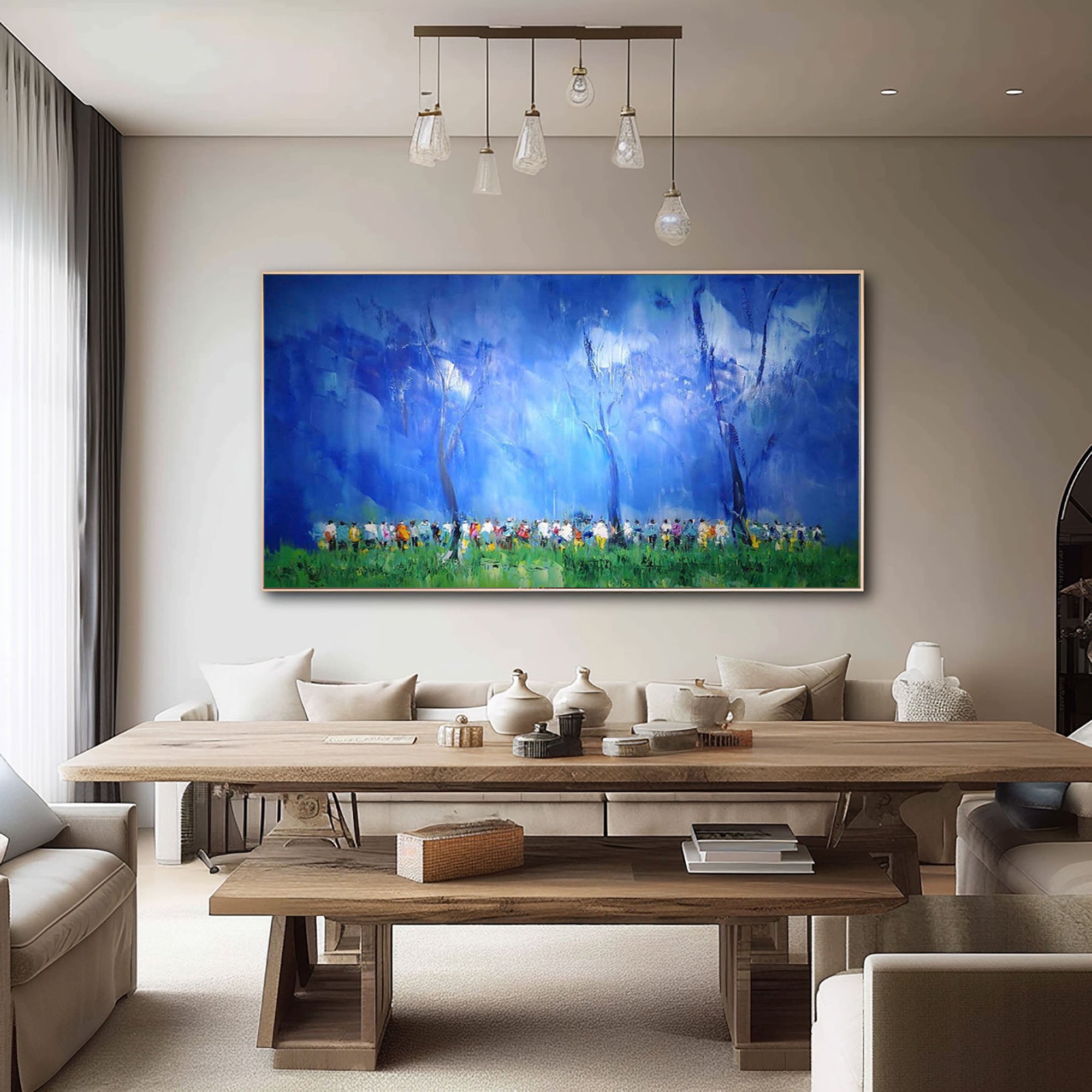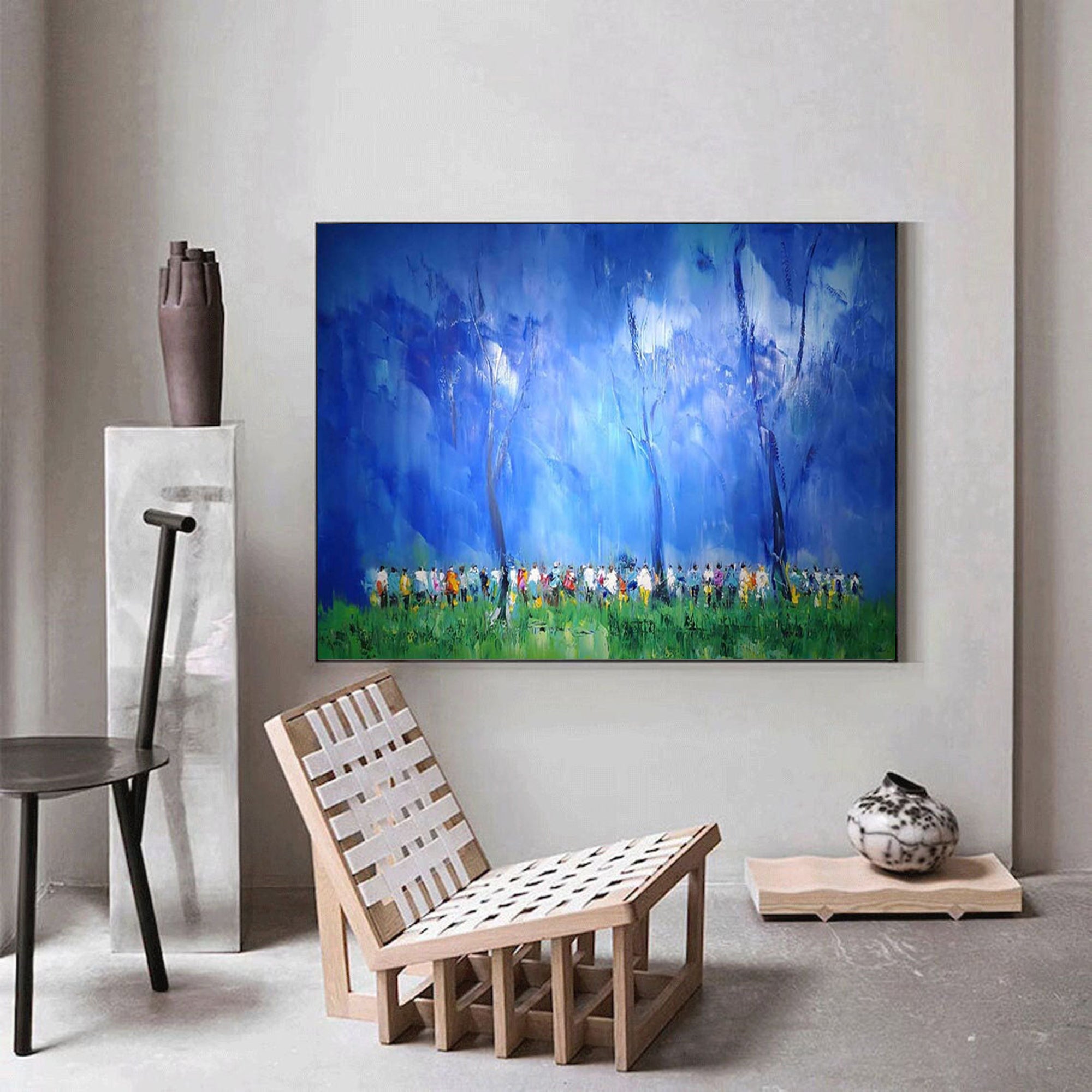 Discover tranquility and depth with our HomeproGlobal Landscape Painting. This artwork captures a serene, mystical forest scene in a palette of vibrant blues that fade into a lush green meadow. Delicate, ethereal figures appear to dance lightly across the field, adding a touch of whimsy and enchantment to the composition. The dynamic contrast between the vivid foreground and the soothing backdrop invites contemplation and wonder, making it a captivating addition to any modern living space or gallery.