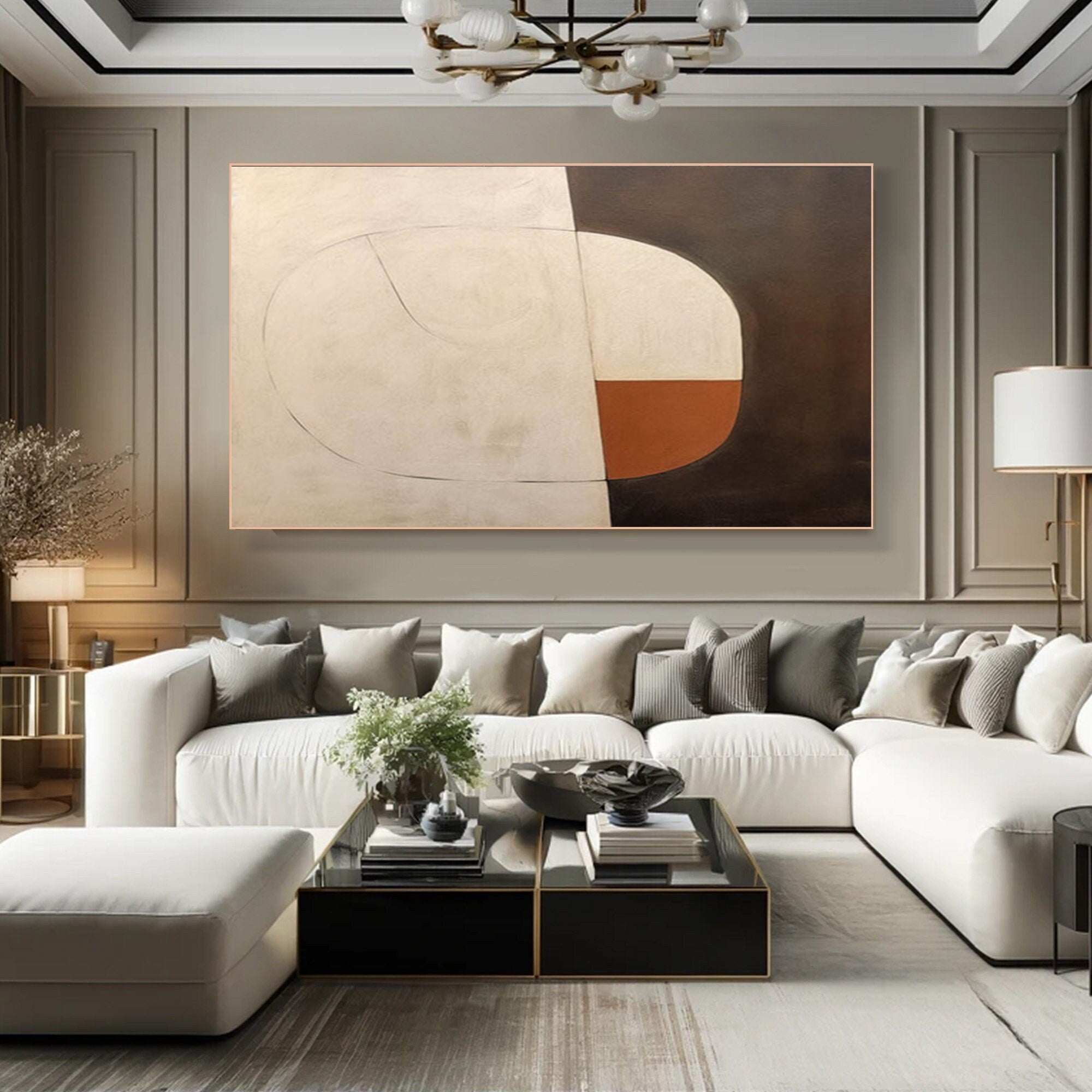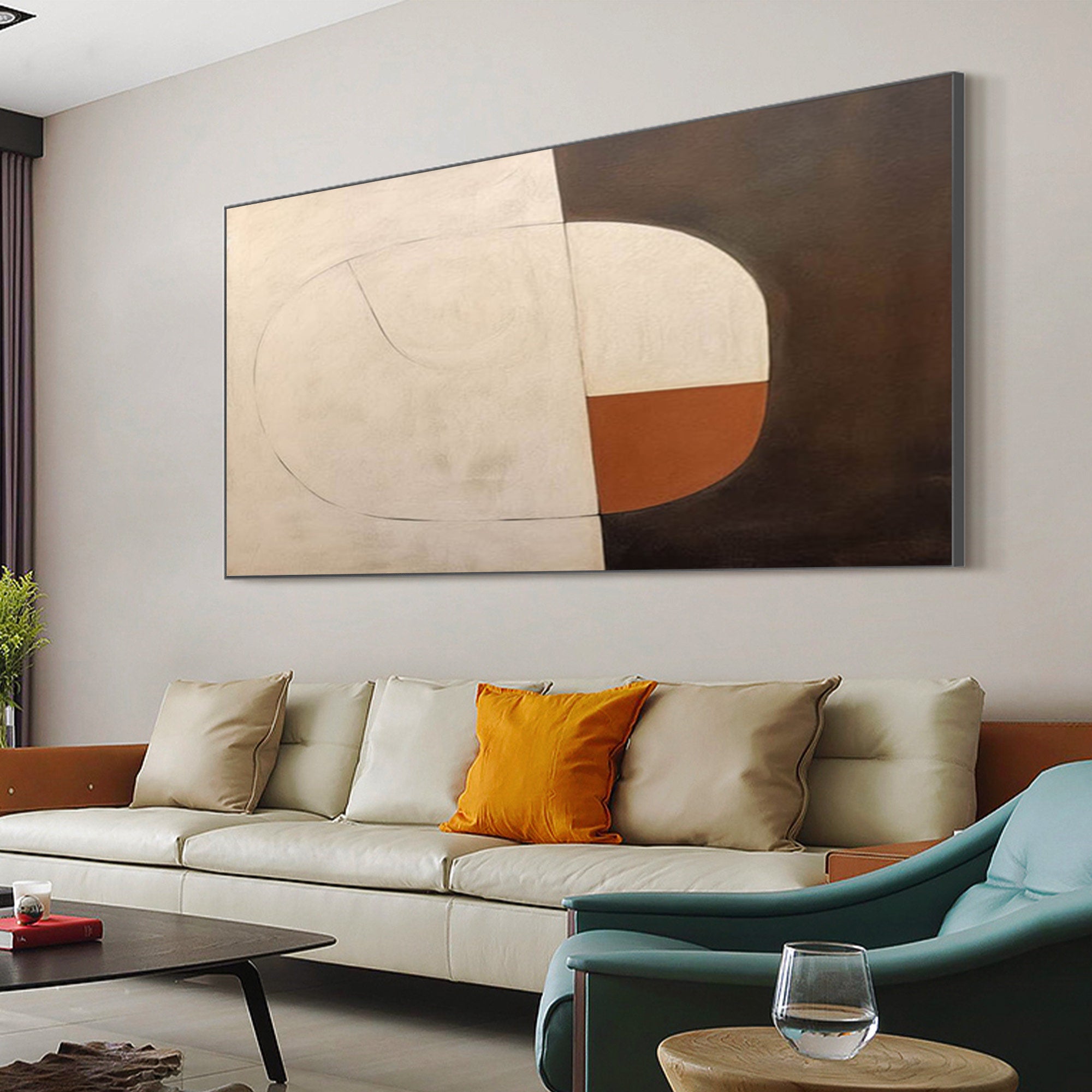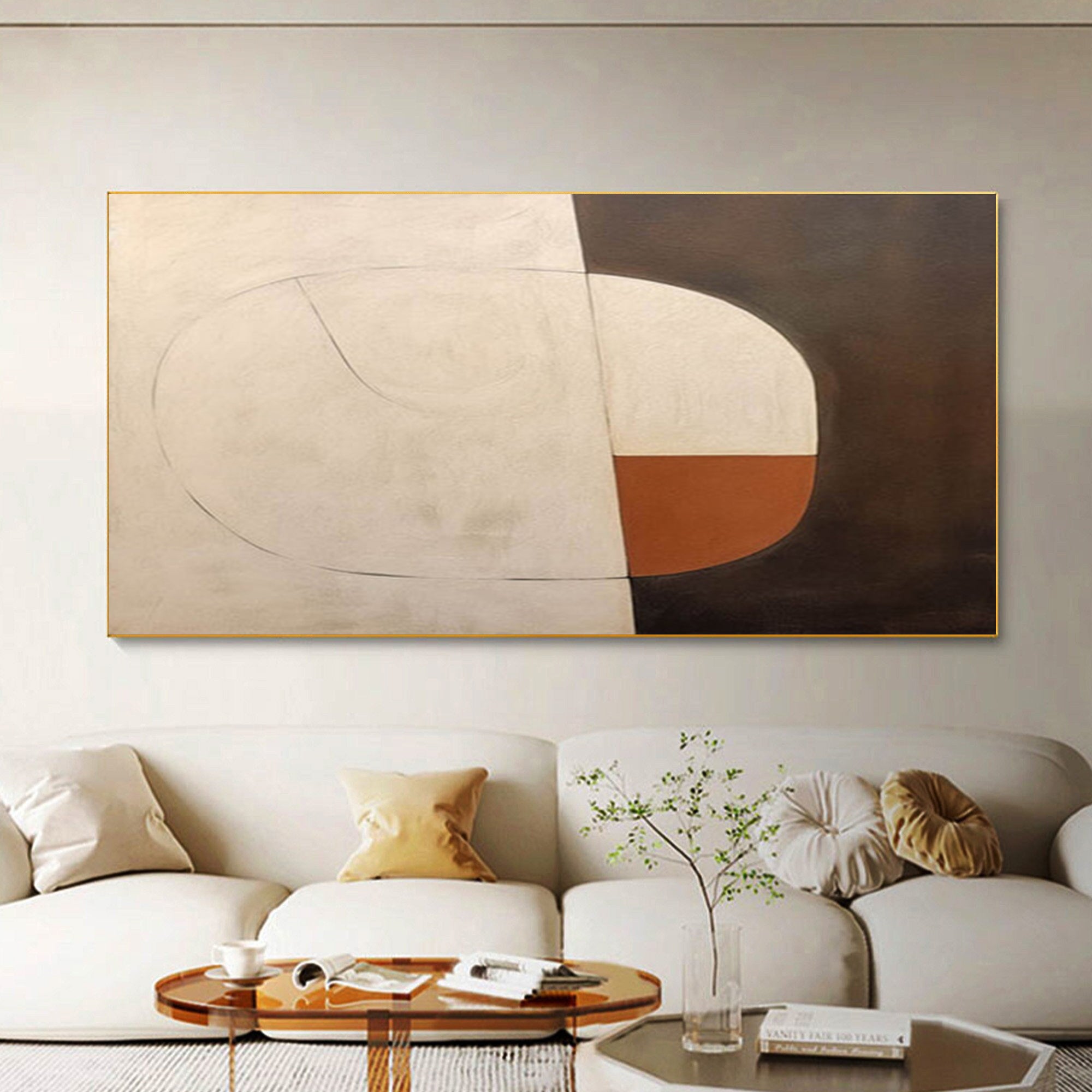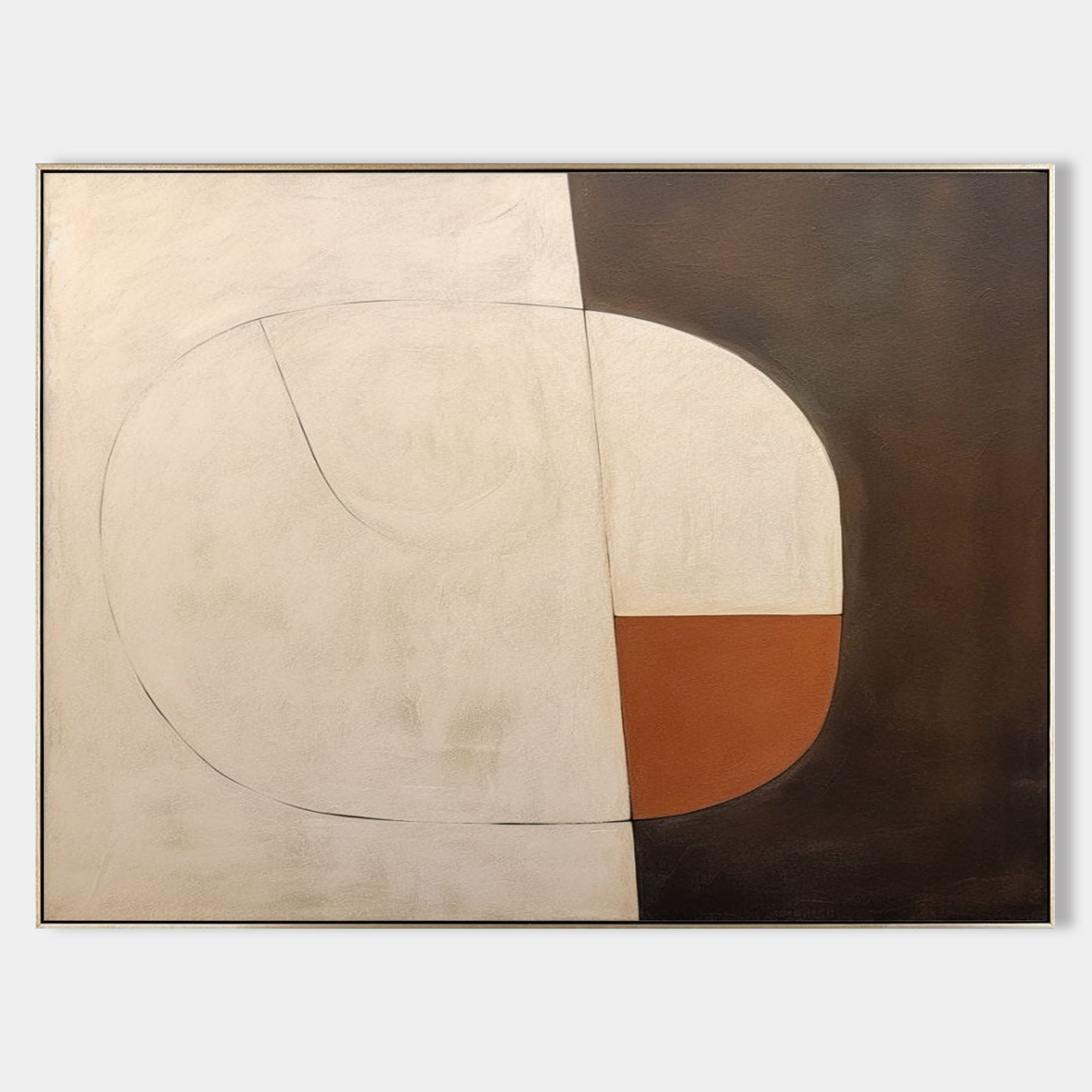 This painting captivates with its bold yet minimalist design, making it an ideal choice for modern home decor. Dominated by soft neutral tones, it skillfully blends shades of gray, white, and deep orange to create a cozy and tranquil atmosphere. The abstract shapes and lines invite contemplation and imagination, making it perfectly suited for a central placement in a living room or office, adding a touch of artistry and modernity to any space. Each stroke and detail demonstrates the artist's meticulous attention, sure to catch the eye of anyone entering the room