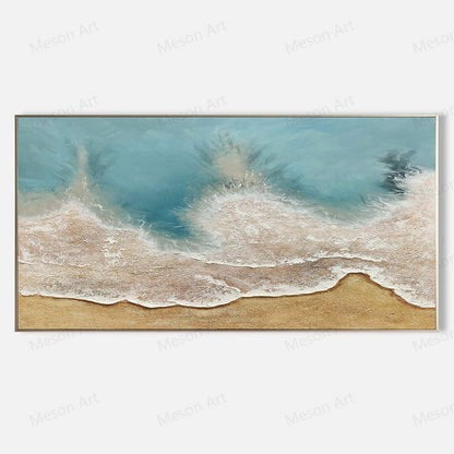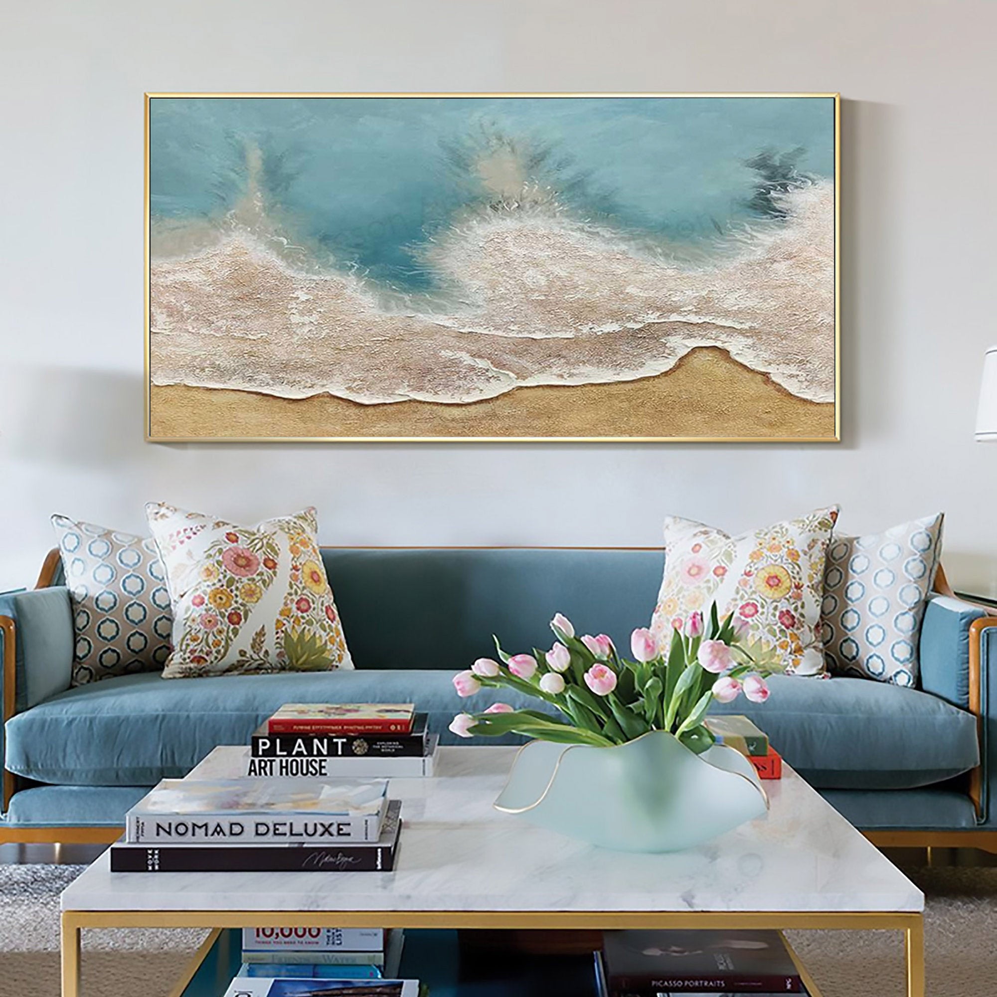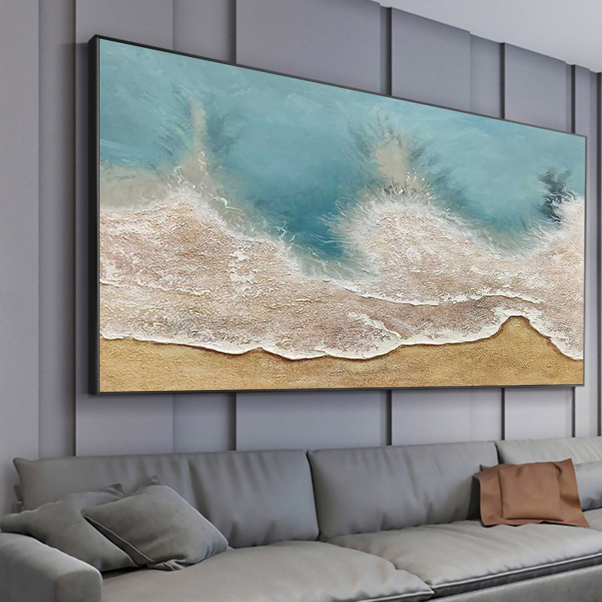 This textured abstract beach and ocean wall art brings the peaceful beauty of the sea and sand to your home. The intricate textures evoke the feeling of ocean waves crashing gently on the shore, with subtle shades of blue and beige capturing the serene coastal ambiance. Perfect for living room wall decor or bedroom wall art, this piece enhances the atmosphere with its abstract, yet organic design.