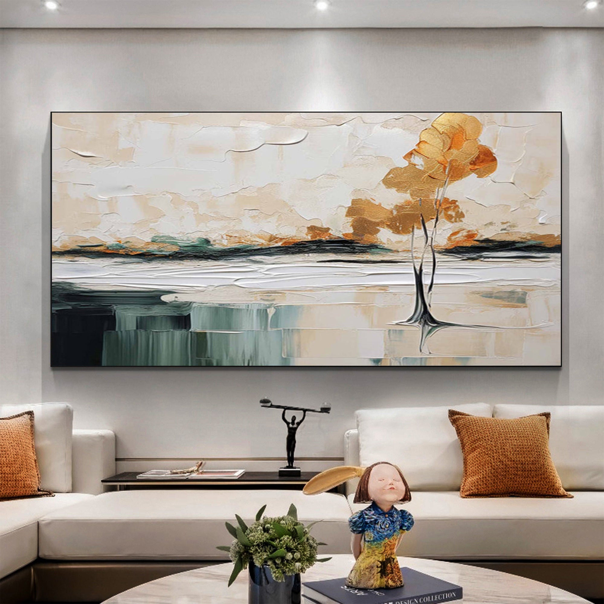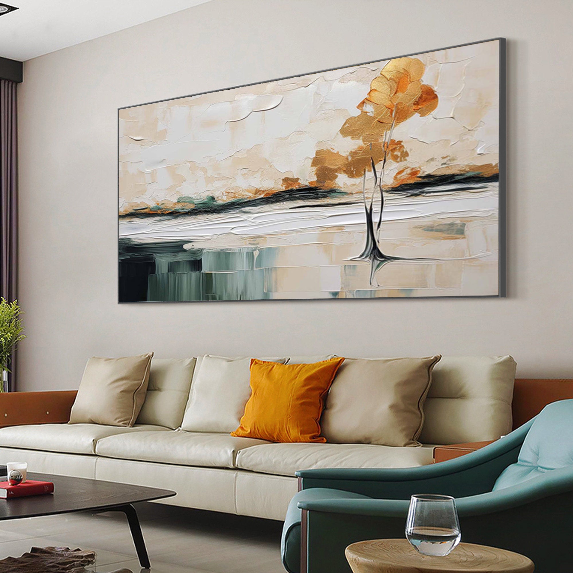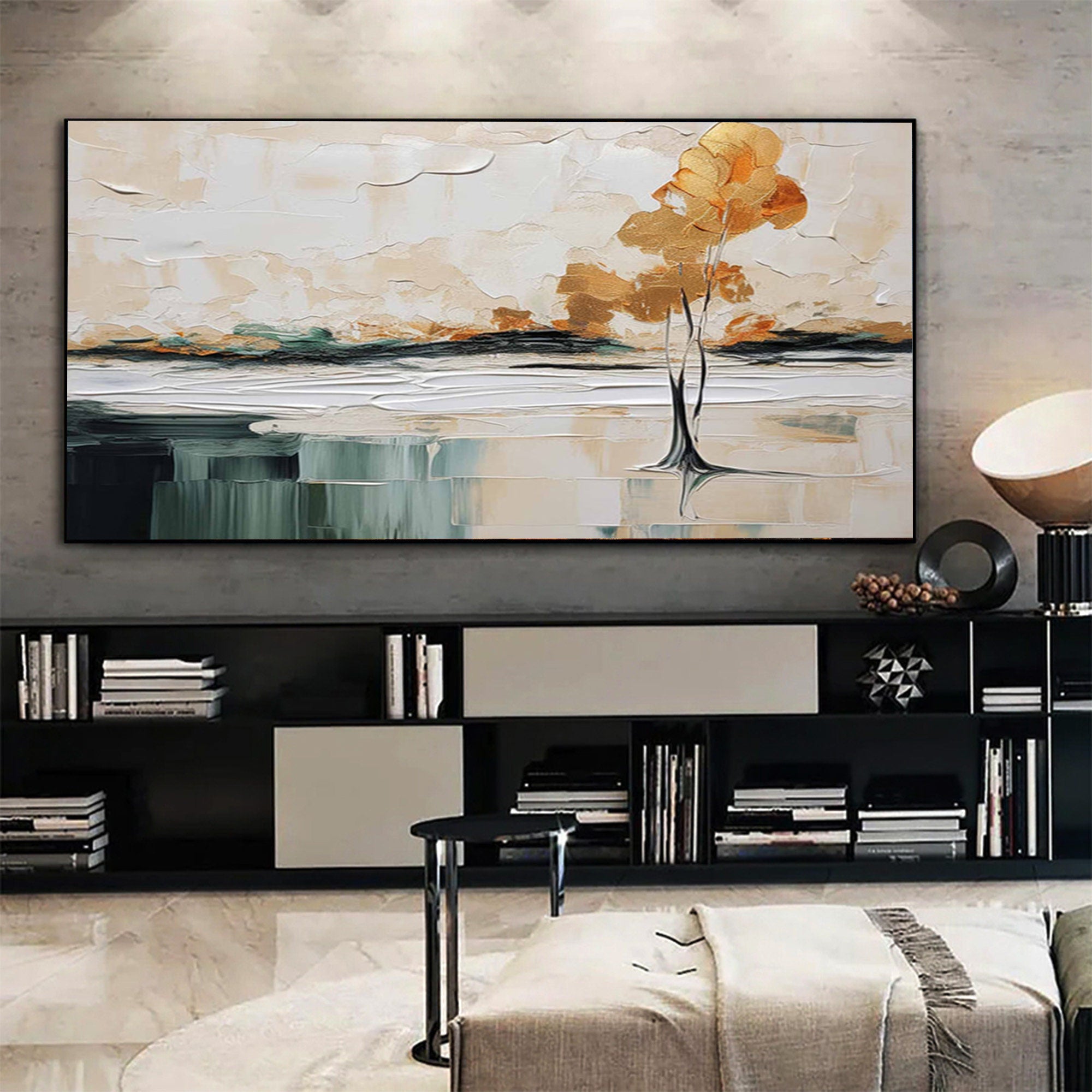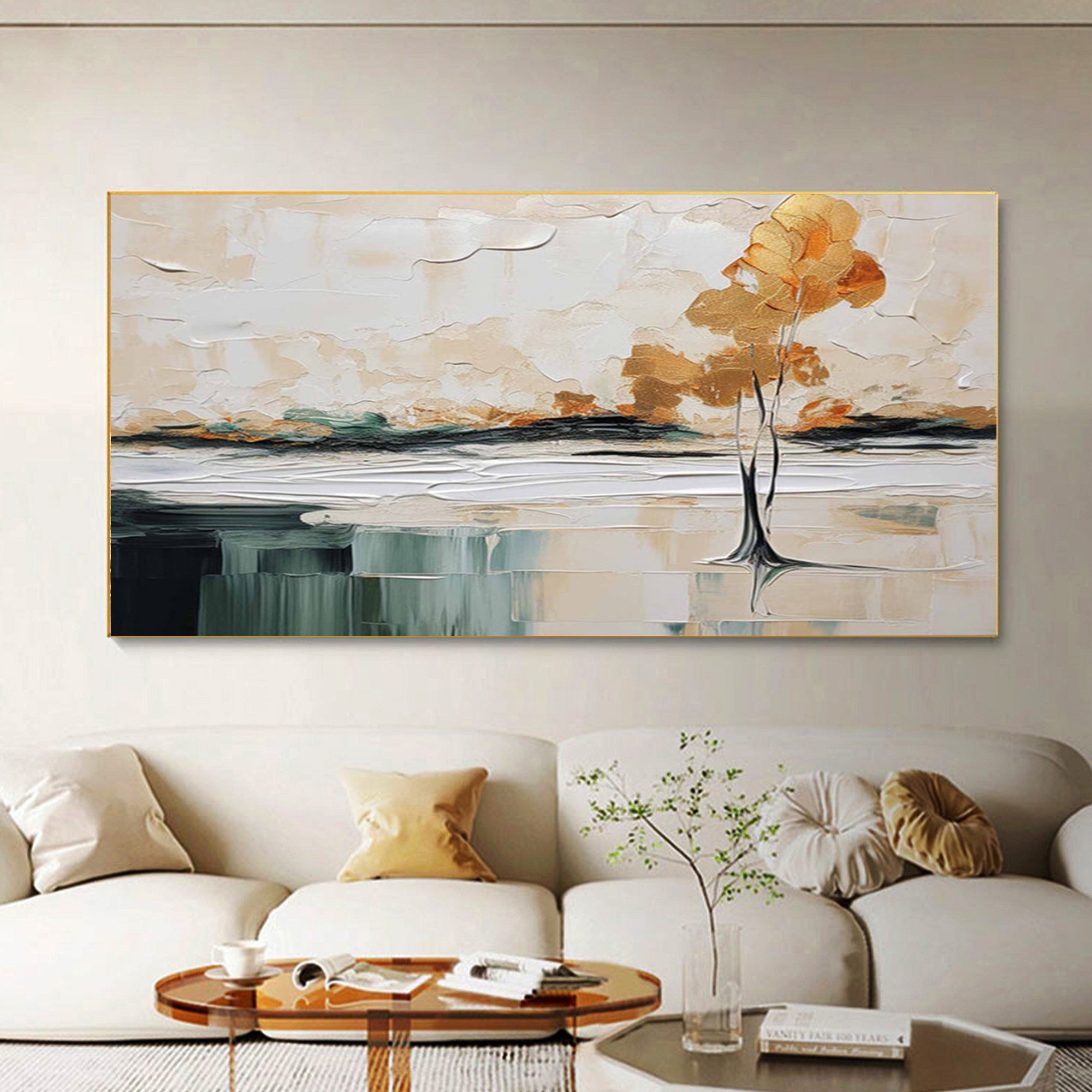 Embrace the serene beauty of nature with our minimalist landscape painting. This artwork features a delicate tree in golden hues standing elegantly against a soft, abstract background, reflecting tranquility and harmony. The subtle blend of earthy colors and the horizon's clean lines evoke a peaceful retreat, ideal for modern living spaces seeking a touch of simplicity and calm.