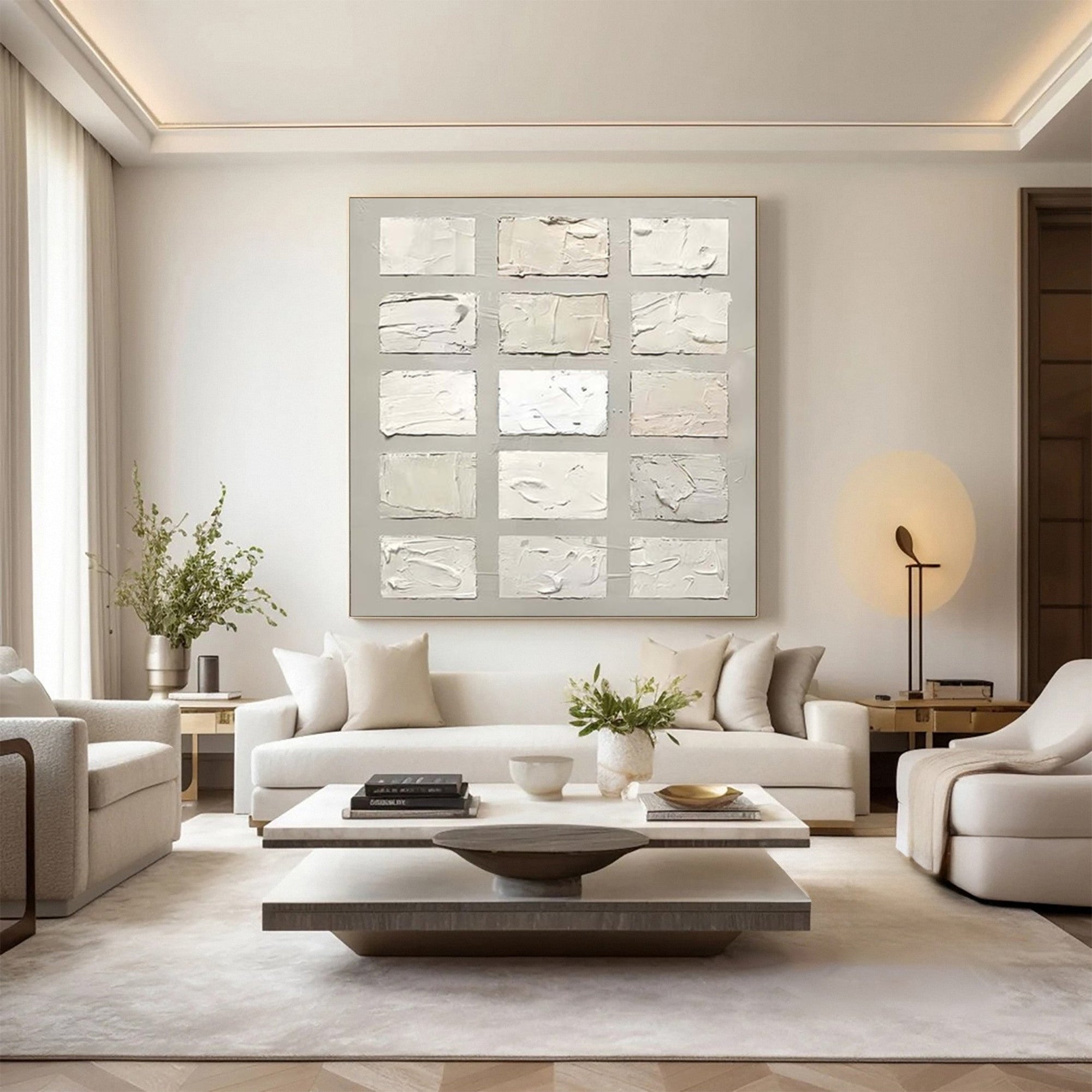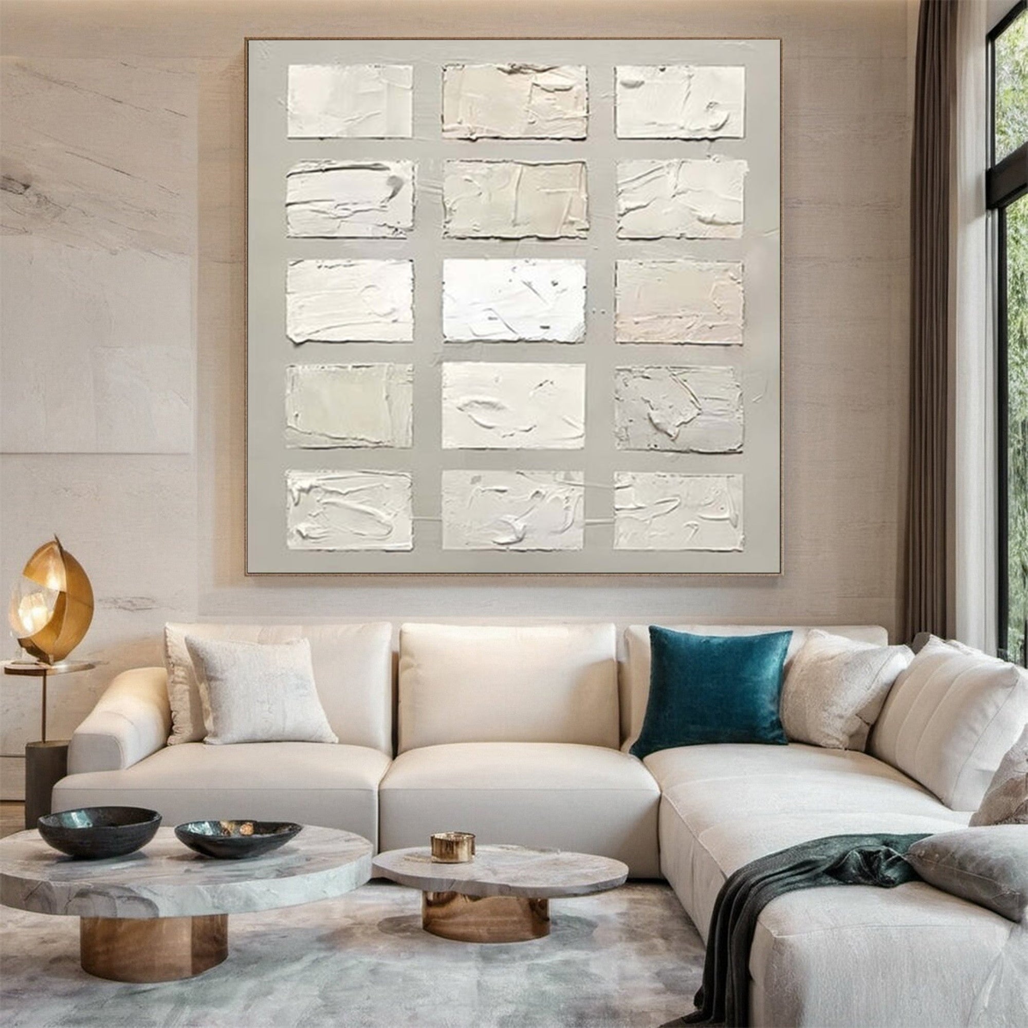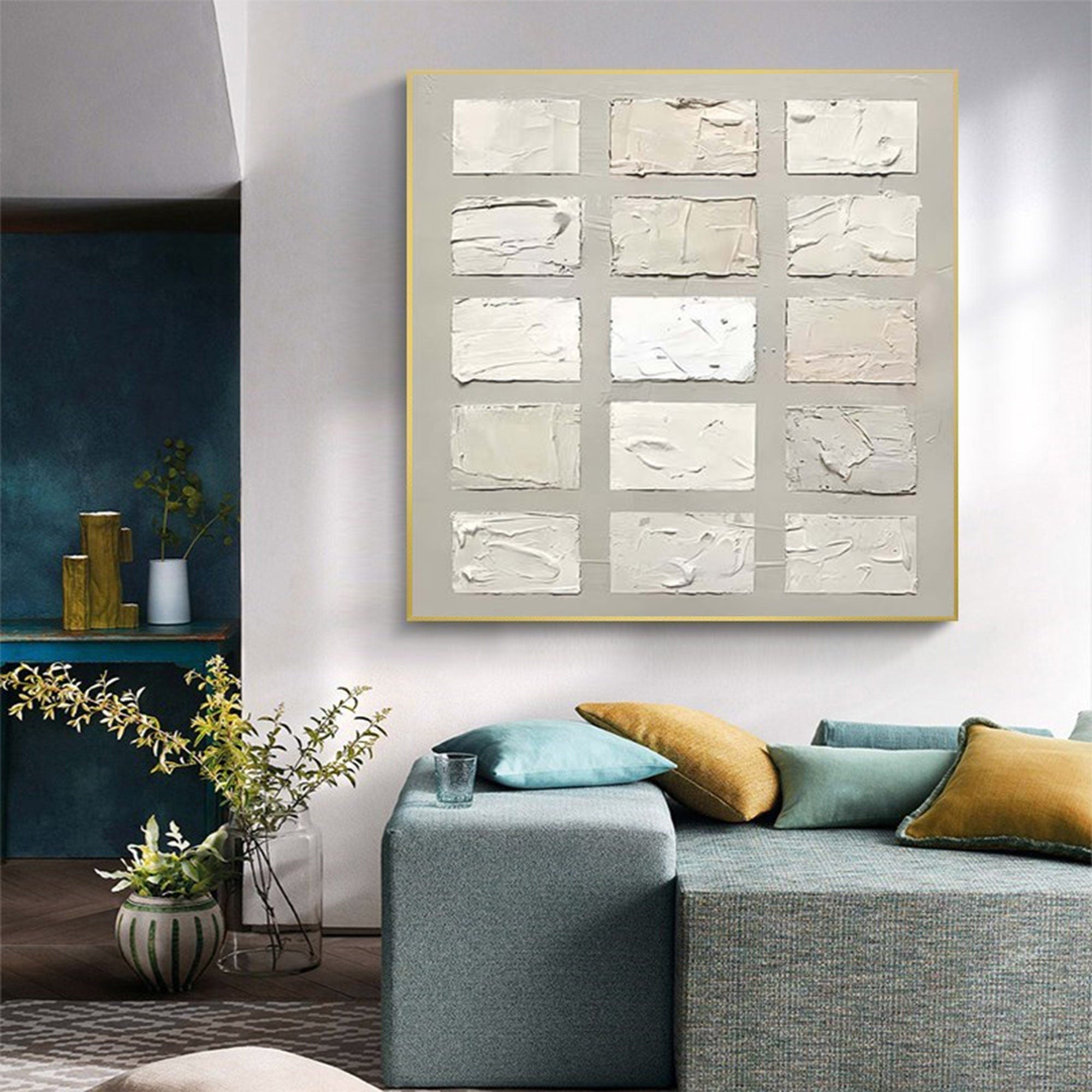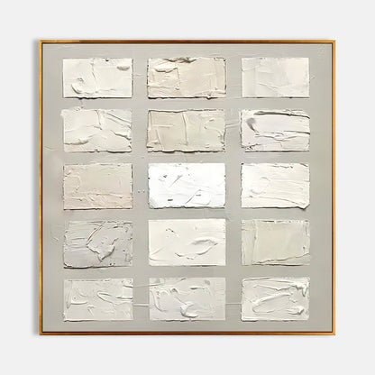 This Wabi Sabi Wall Art features a stunning textured square design, showcasing multiple abstract rectangular forms in a muted color palette. The unique texture and the simplistic arrangement of squares embody the Wabi Sabi philosophy of embracing beauty in imperfection and natural simplicity. The artwork adds a refined and sophisticated touch to your home, making it a perfect choice for those looking for large wall art or textured wall art. Ideal for creating a serene atmosphere, this piece enhances modern home decor and suits a variety of interior styles.