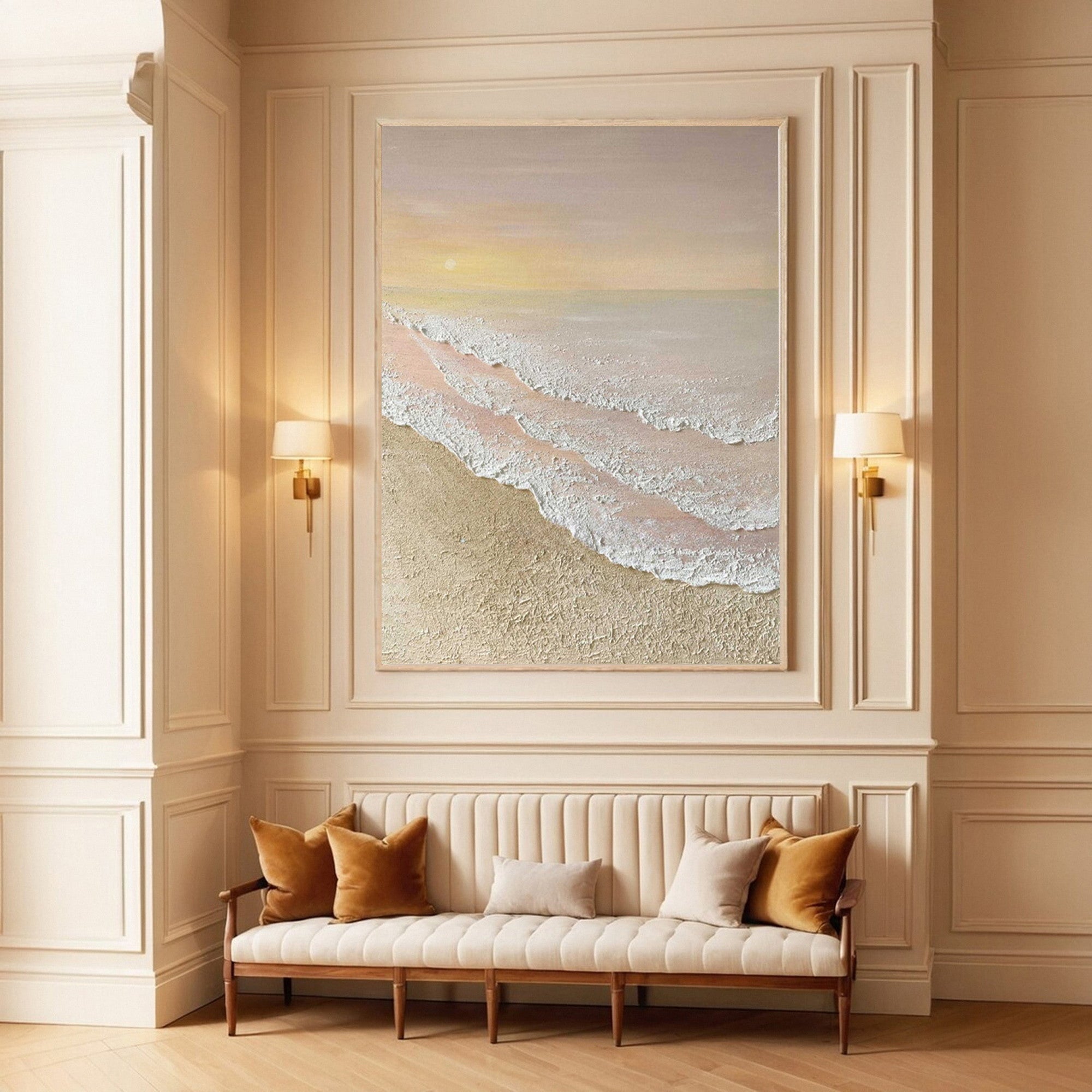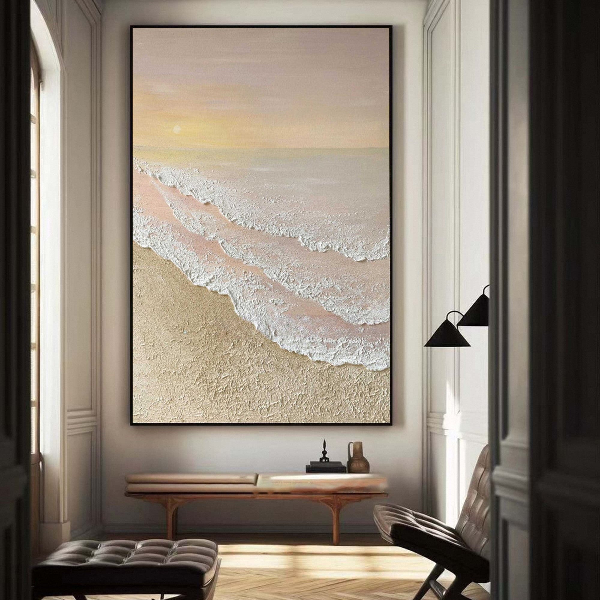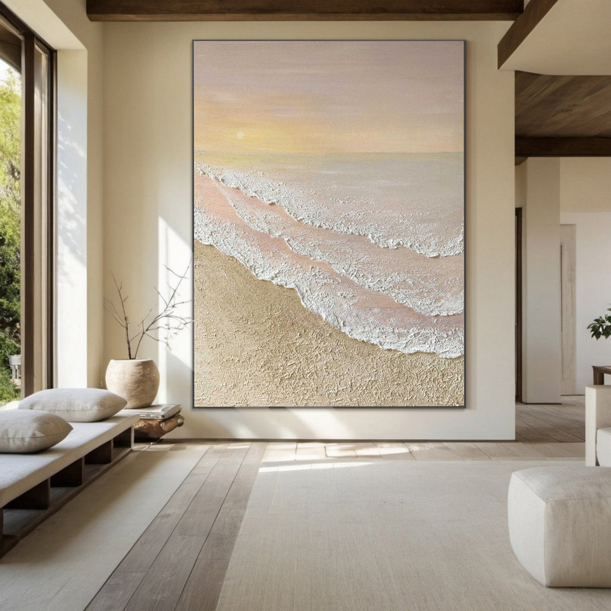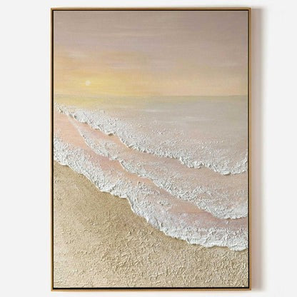 This textured abstract wall art beautifully captures the serenity of a beach at sunset, blending natural elements with abstract style. The large canvas art features dynamic brush strokes and rich textures, creating a unique depiction of the ocean meeting the shoreline. The use of warm tones in the sunset sky contrasts perfectly with the cool colors of the sea, making this piece a stunning focal point in any room.