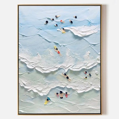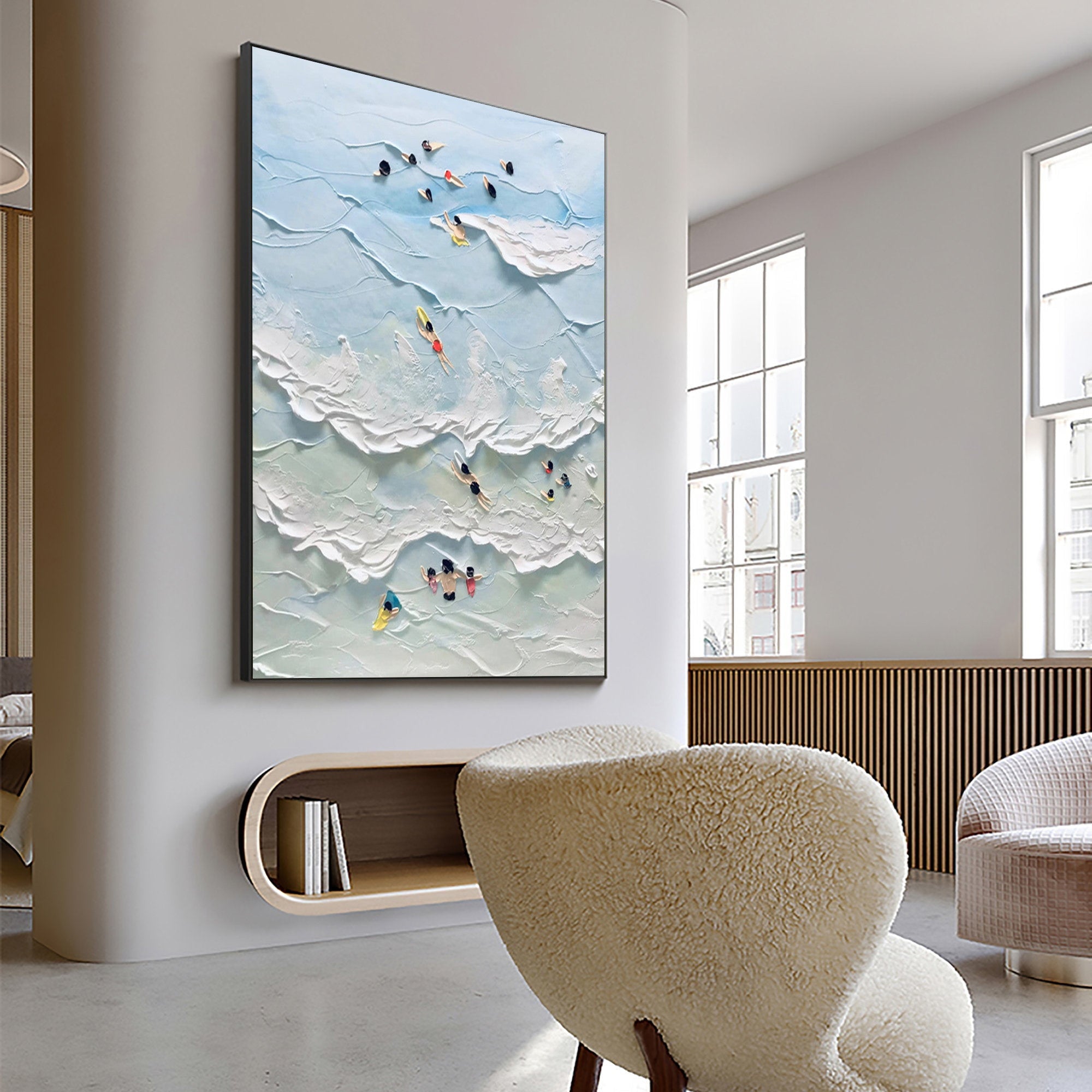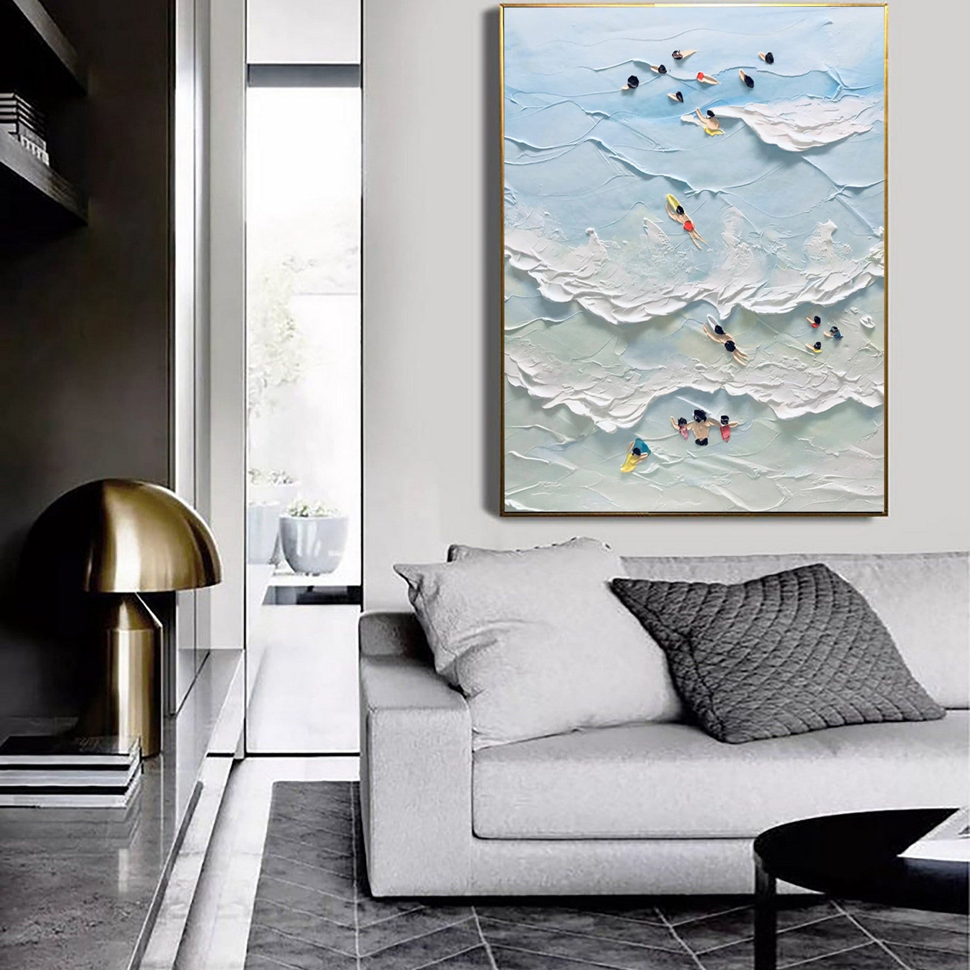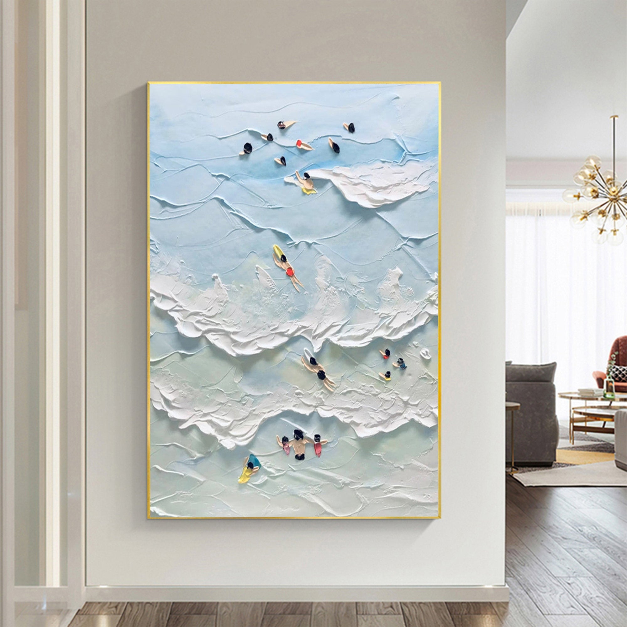 This textured plaster ocean wall art brings the beauty of the sea to your walls, depicting swimmers enjoying the waves in a stunning blend of texture and color. Ideal for coastal wall art and modern wall decor, this piece captures the essence of serene seaside moments, making it perfect for creating a tranquil yet dynamic atmosphere in your home.