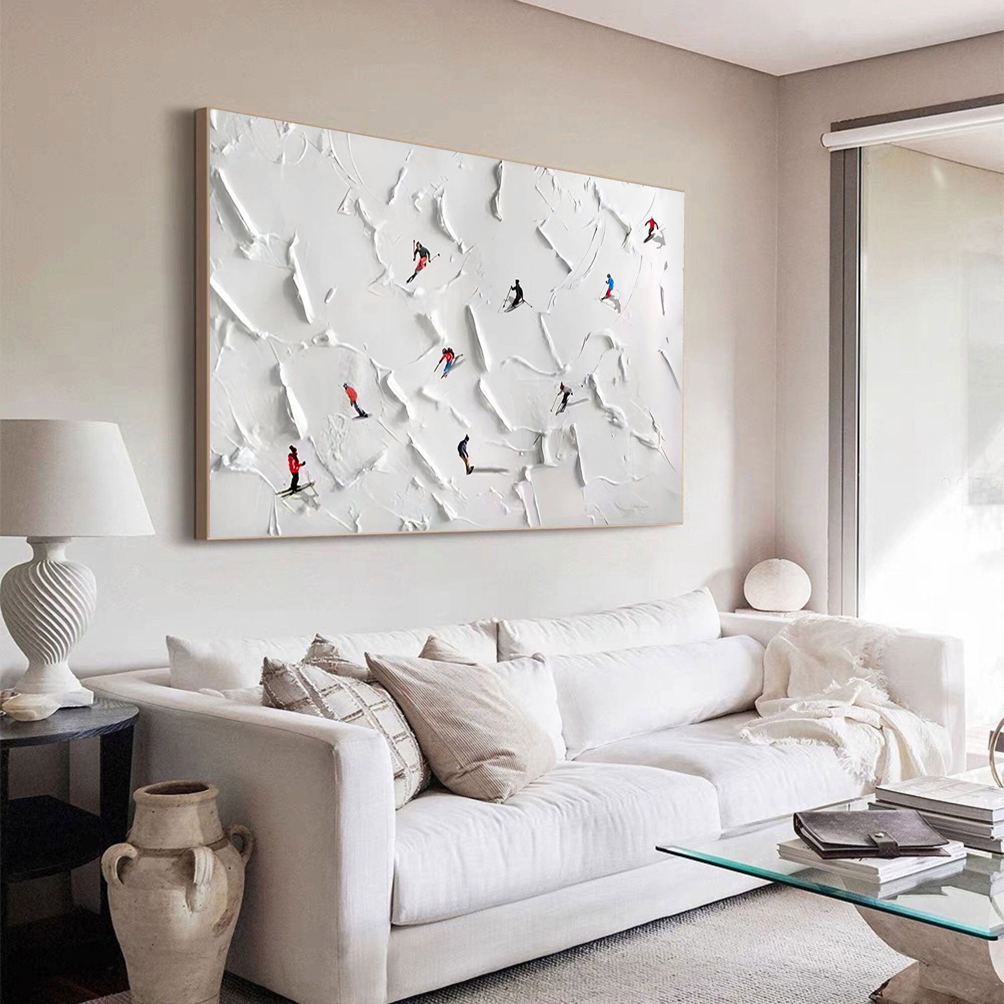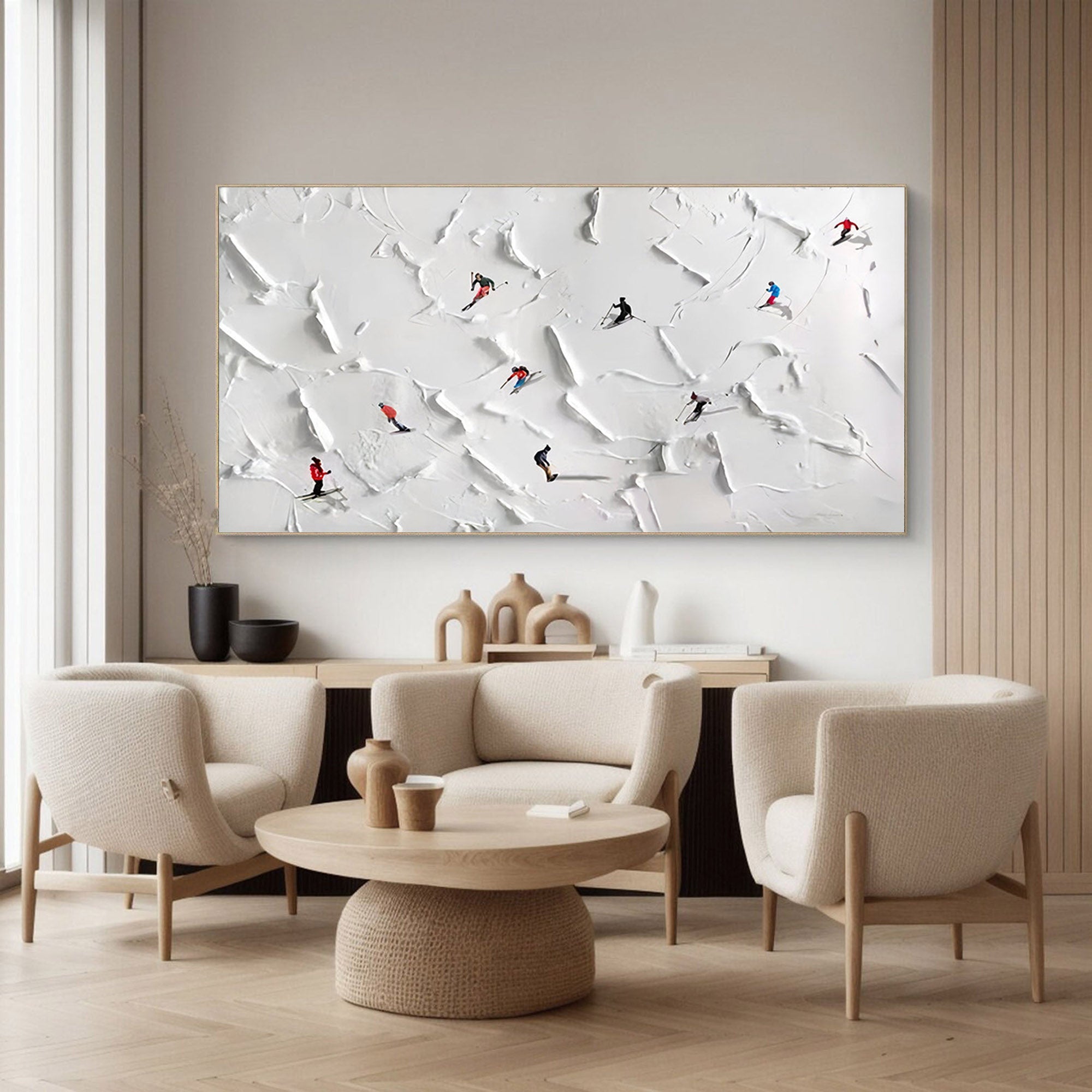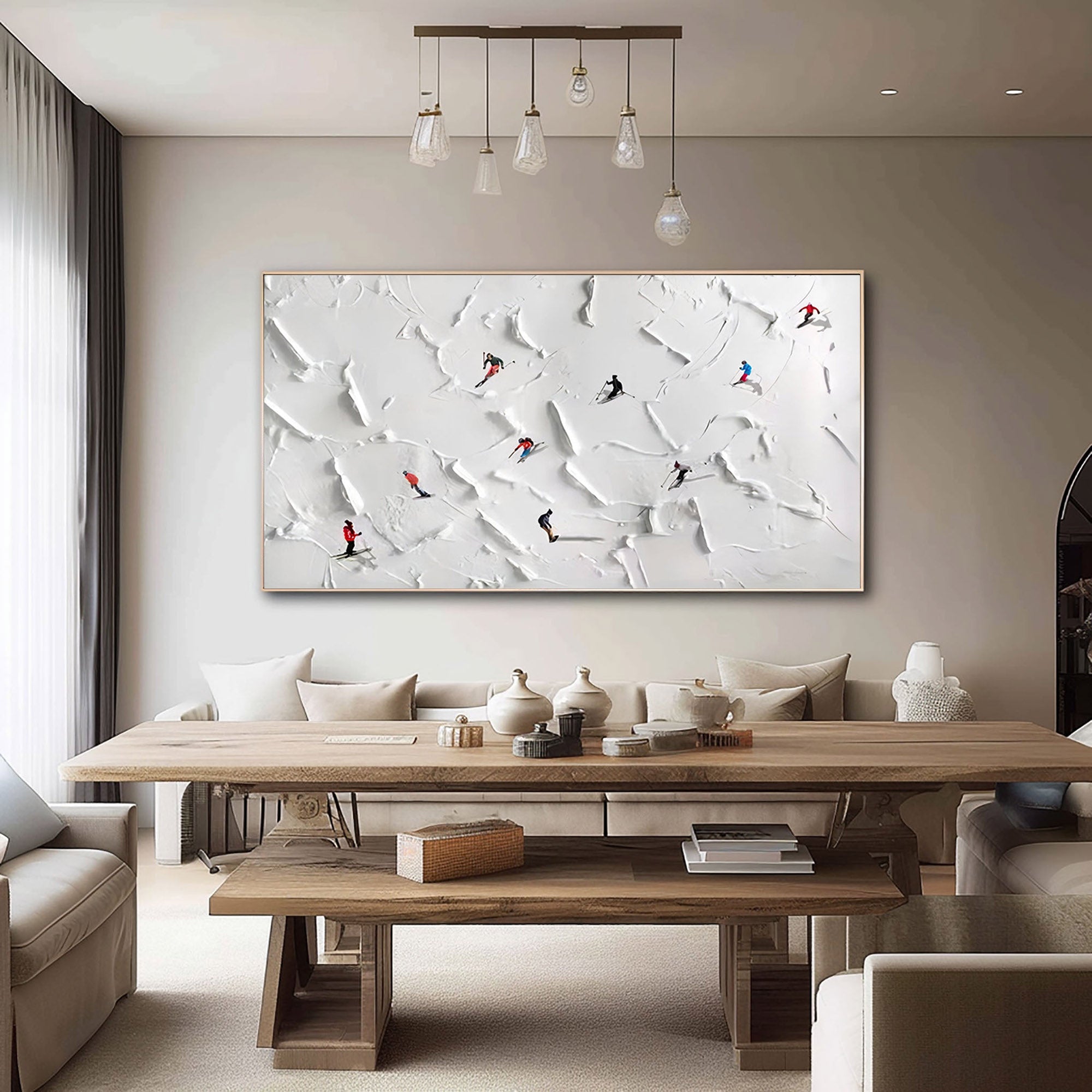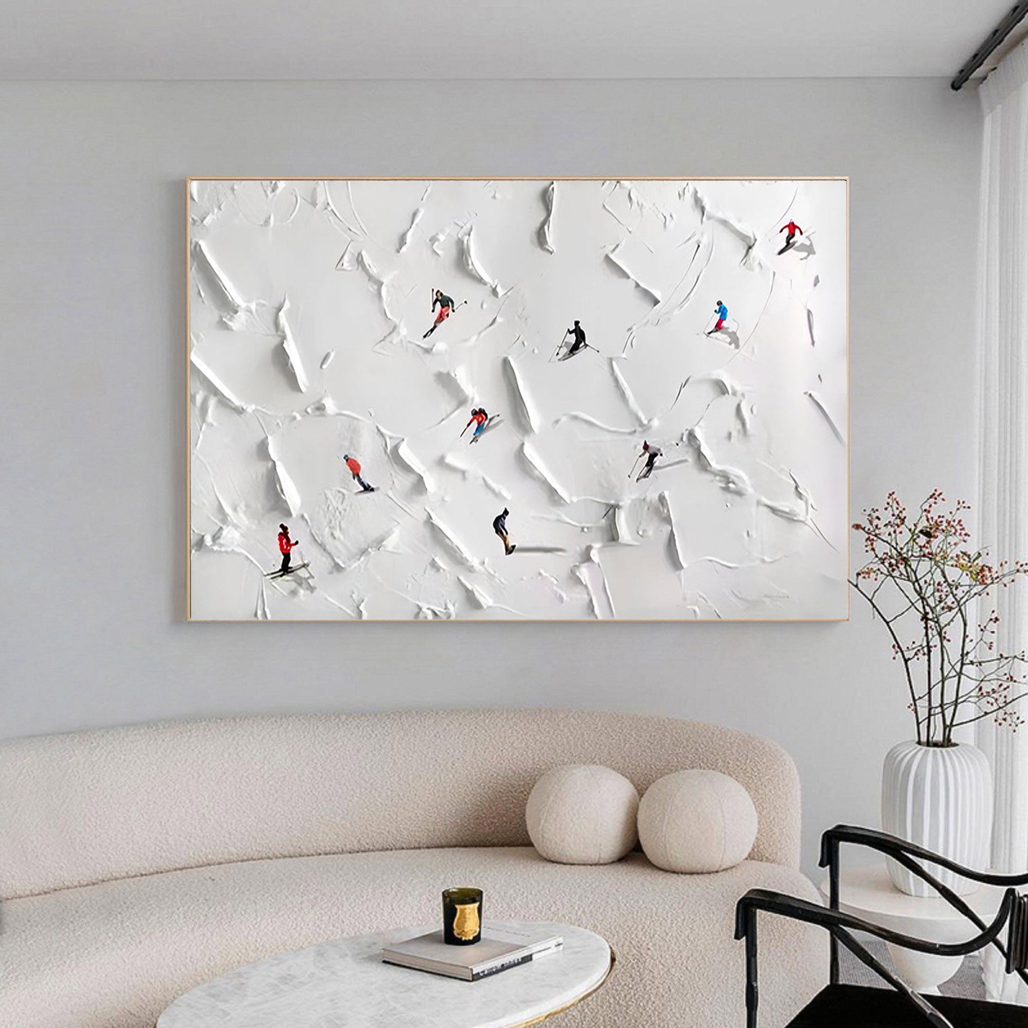 This textured skiing scene horizontal wall art captures the excitement of skiers gliding down snowy slopes with incredible detail and texture. The layered plaster effect brings the motion and energy of a winter landscape to life, making it an excellent choice for modern wall art and seasonal home decor. Ideal for adding a touch of winter charm, this artwork suits both contemporary interiors and mountain retreats.
