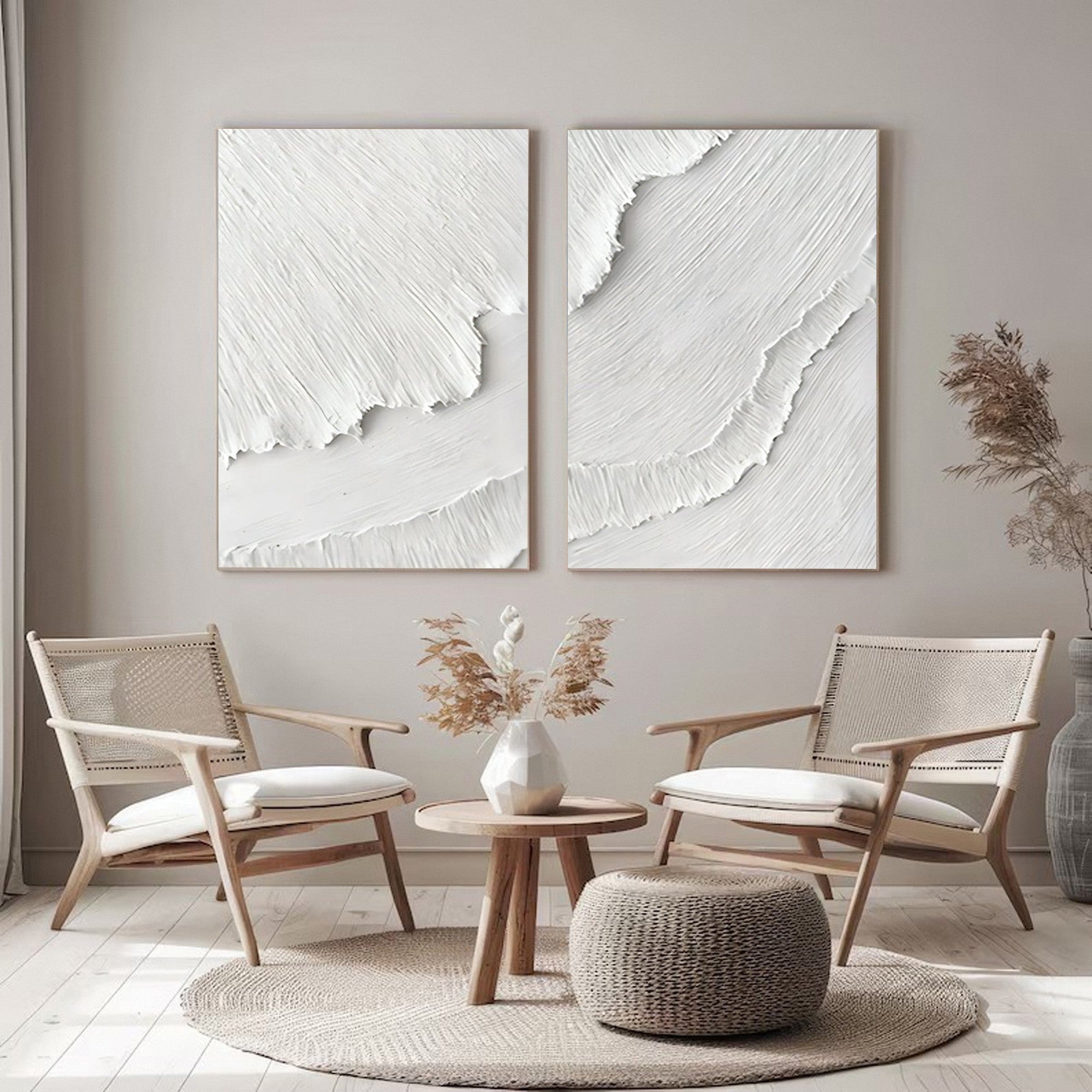 Part of our curated collection of textured wall art, these pieces seamlessly complement both modern and minimalist styles. Whether you're looking to enhance your living space with subtle elegance or seeking artwork for sale, this wall art set provides the ideal solution for your home. Elevate your interior with the beauty and simplicity of minimalist wall art.