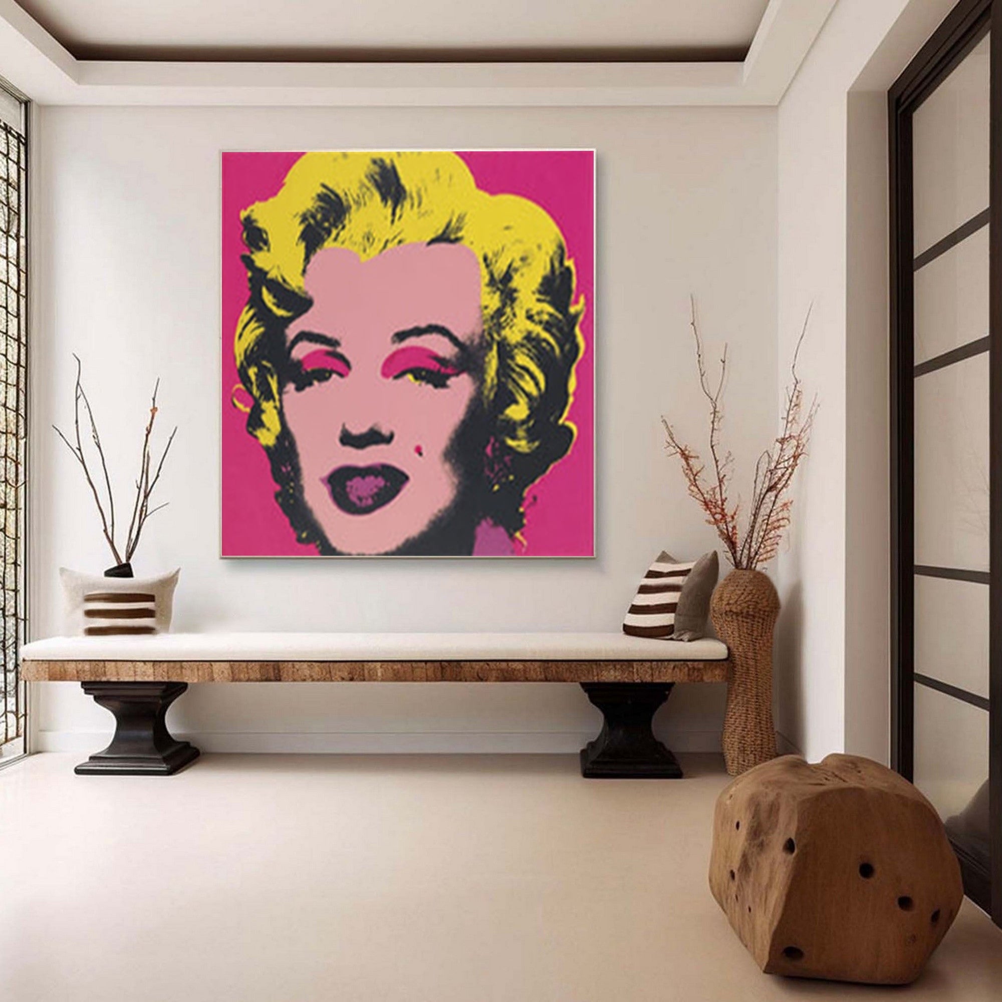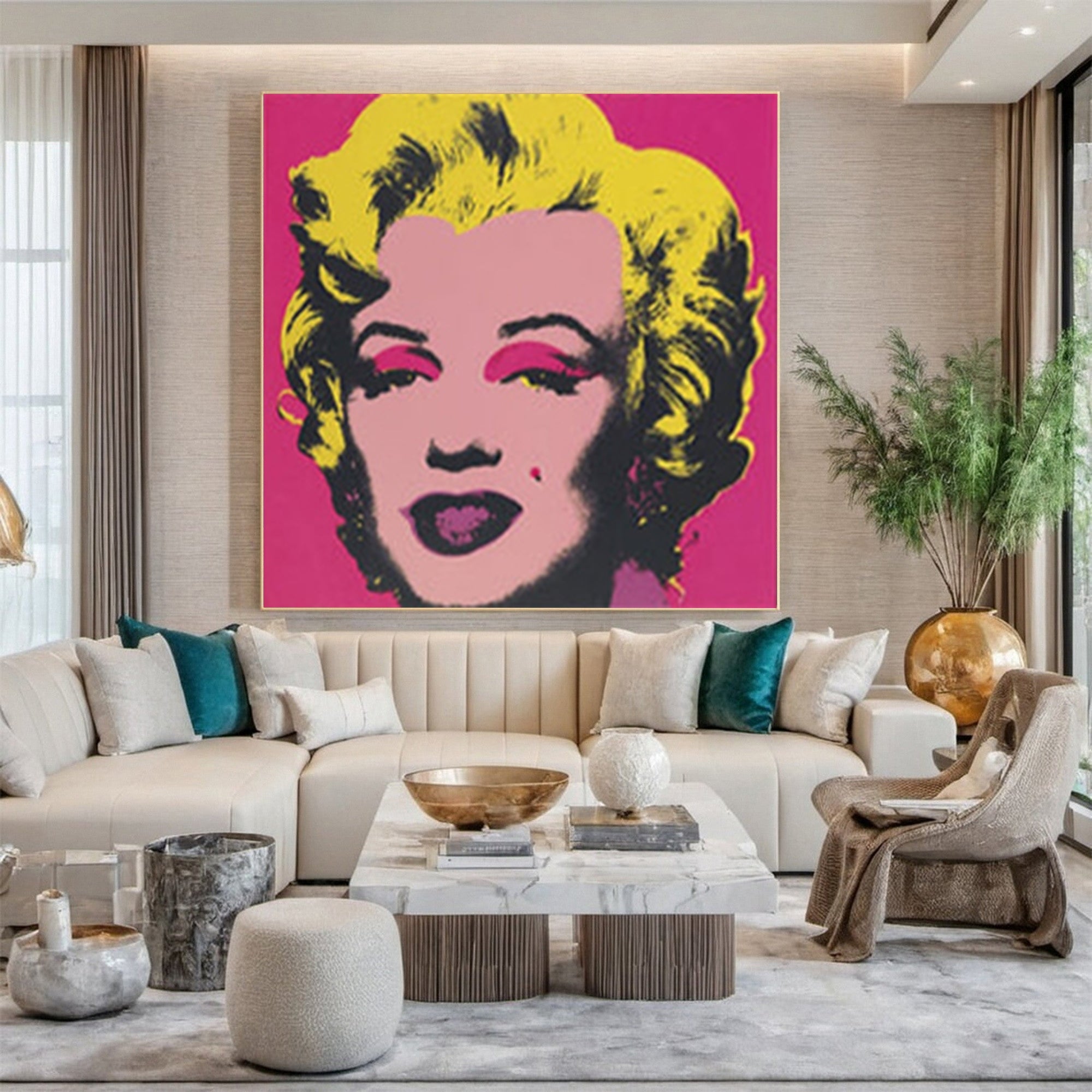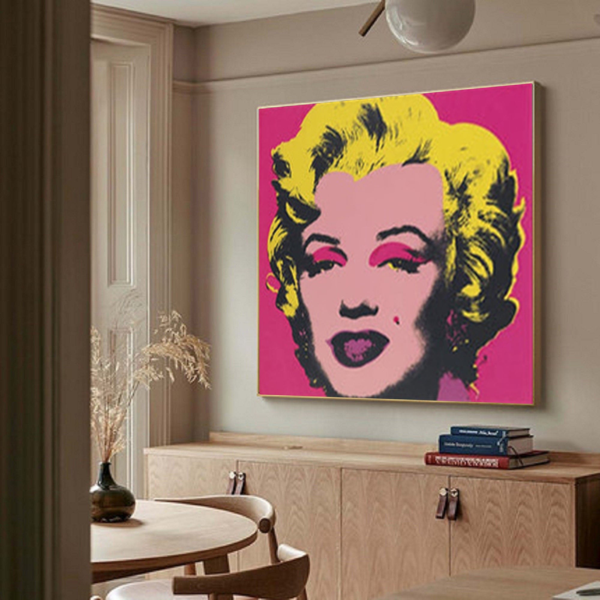 Enhance your interior with our Marilyn Monroe Hand Painted Art Portrait for Vibrant Home Decor, a striking canvas that embodies the spirit of pop art with a modern twist. This hand painted art features the iconic Marilyn Monroe, bringing a piece of classic Hollywood glamour right into your living space. Perfect for aficionados of unique home decor paintings, this artwork adds a burst of color and style to any room, making it an excellent choice for those looking to buy paintings online. Explore our Homeproglobal wall art collection to find this and other captivating paintings for sale.
