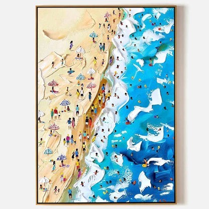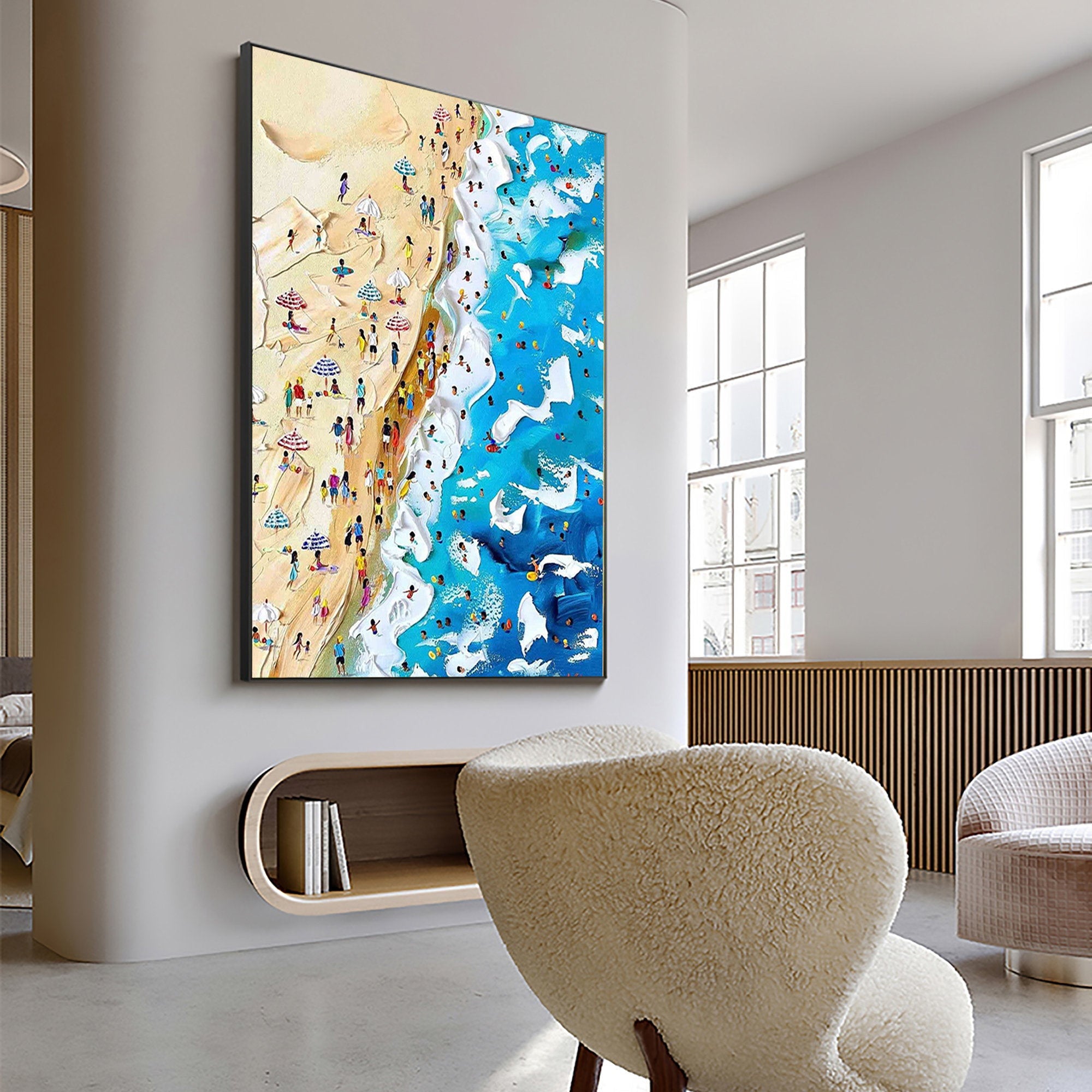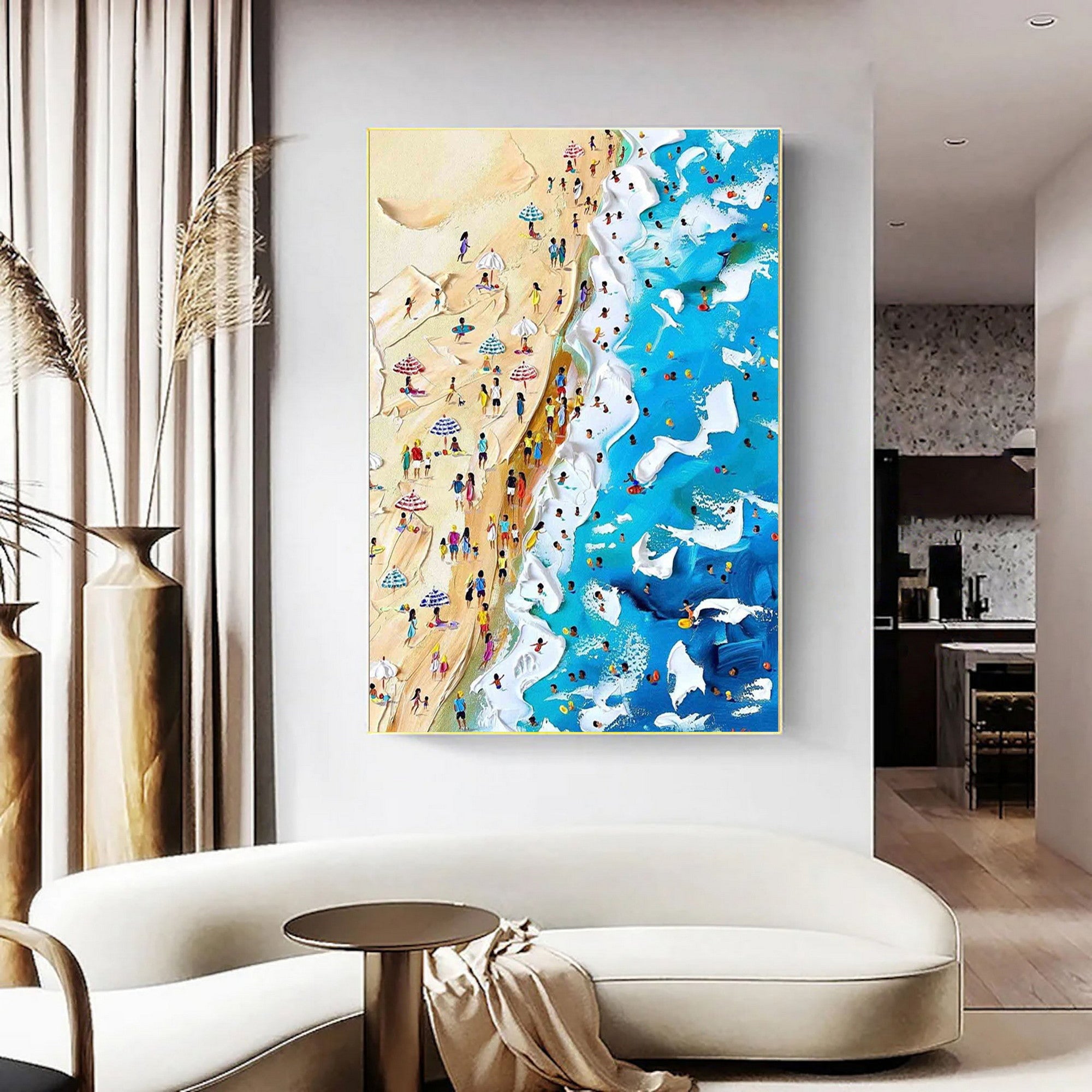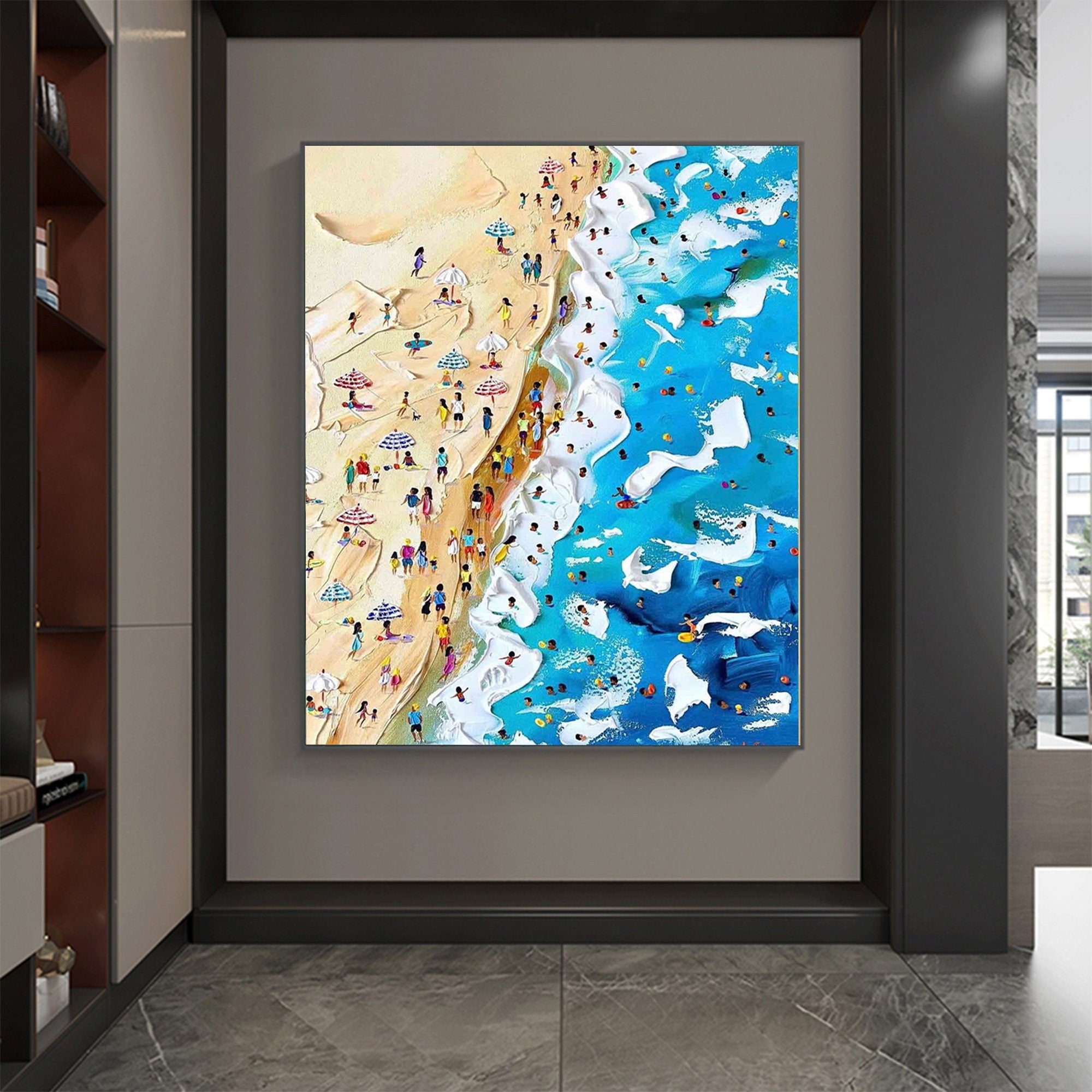 This colorful beach scene textured wall art captures the vibrant energy of a bustling coastline, featuring people enjoying the sand and sea. The dynamic composition and rich textures make it a perfect addition to coastal wall art collections or living room wall decor. The artwork blends modern wall art techniques with a playful and serene aesthetic, creating a piece that evokes the joy of seaside adventures.